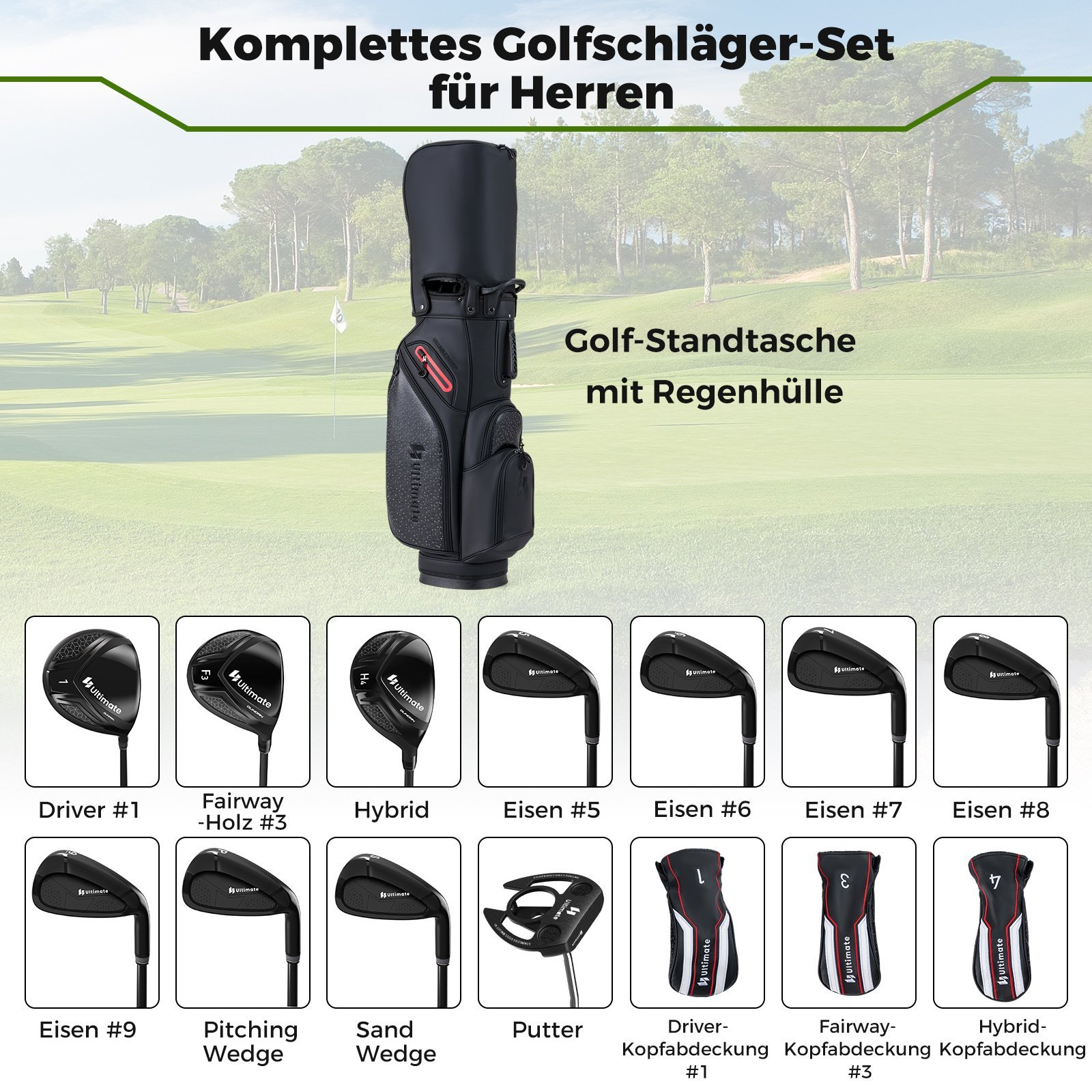 - Išbaigtas 11 dalių golfo lazdų rinkinys dešiniarankiams.