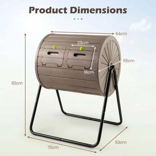 Pristatome novatorišką 142 litrų talpos sodo komposterį, skirtą efektyviam ir tvariam kompostavimui. Dvi nepriklausomos kameros leidžia nepertraukiamai kompostuoti, o 360° besisukanti konstrukcija su vidiniais maišymo sparneliais užtikrina greitą ir patogų procesą. Pagamintas iš tvirto, BPA neturinčio PP plastiko ir stabilaus metalinio rėmo, šis komposteris yra ilgaamžis ir atsparus įvairioms oro sąlygoms. Jo medžio imitacijos išvaizda suteiks elegancijos jūsų lauko erdvei.