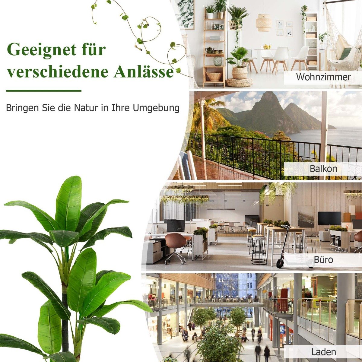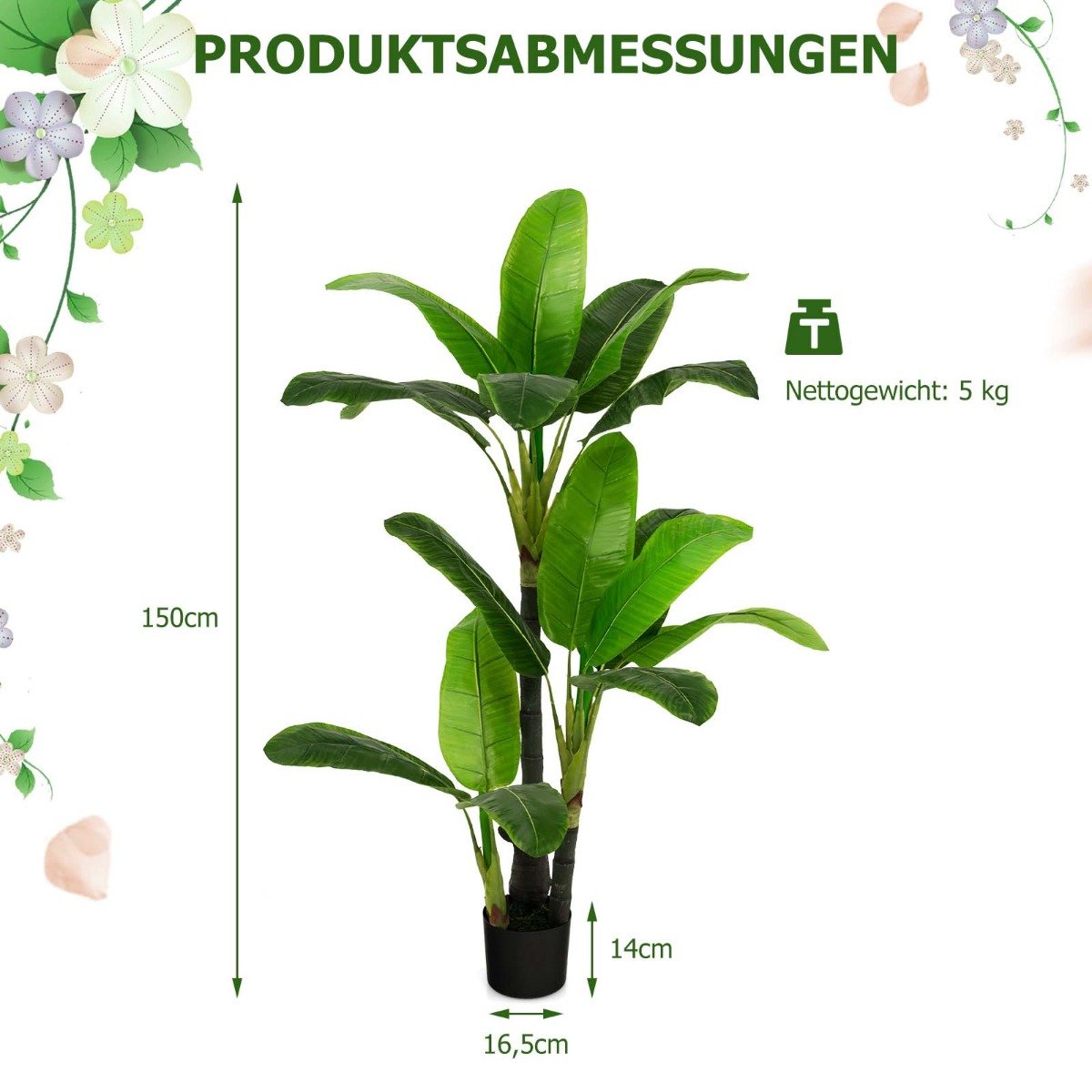 Pristatome elegantišką ir natūraliai atrodantį 150 cm aukščio dirbtinį bananų medį, kuris suteiks jūsų namams tropikų dvelksmą. Su 18 didelių, gyvybingų lapų ir tvirtu pagrindu šis augalas yra puikus pasirinkimas norintiems lengvai ir be pastangų pagyvinti interjerą.