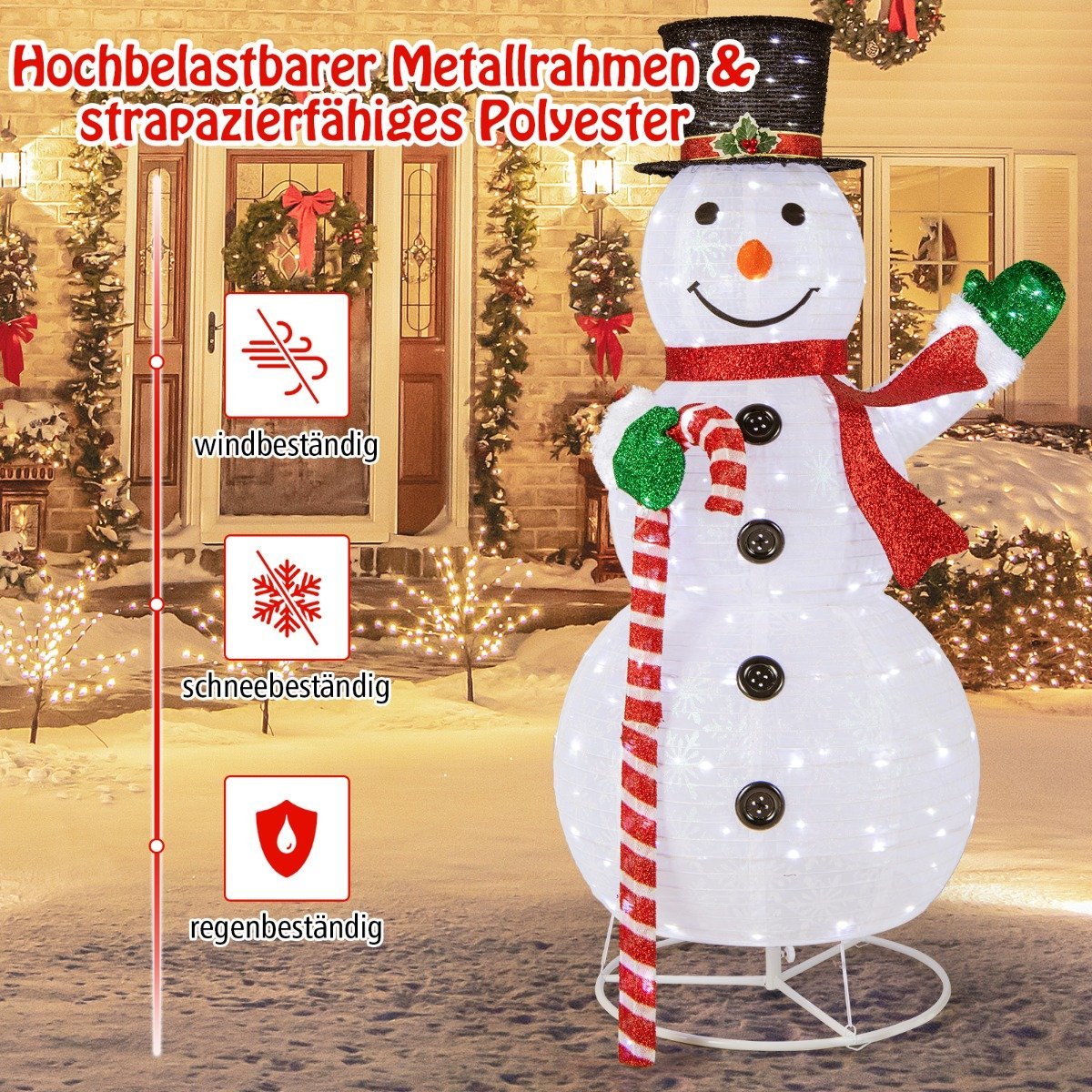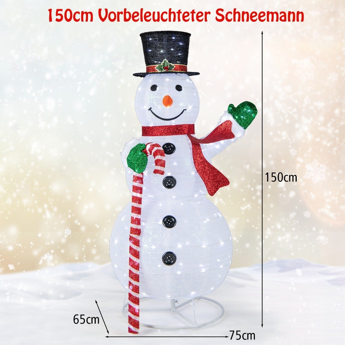 Sukurkite pasakišką šventinę atmosferą su šiuo įspūdingu, 150 cm aukščio LED apšviestu Kalėdų seneliu. Jis taps Jūsų sodo ar namų akcentu, pasitiksiančiu svečius ir sukursiančiu džiugią nuotaiką.