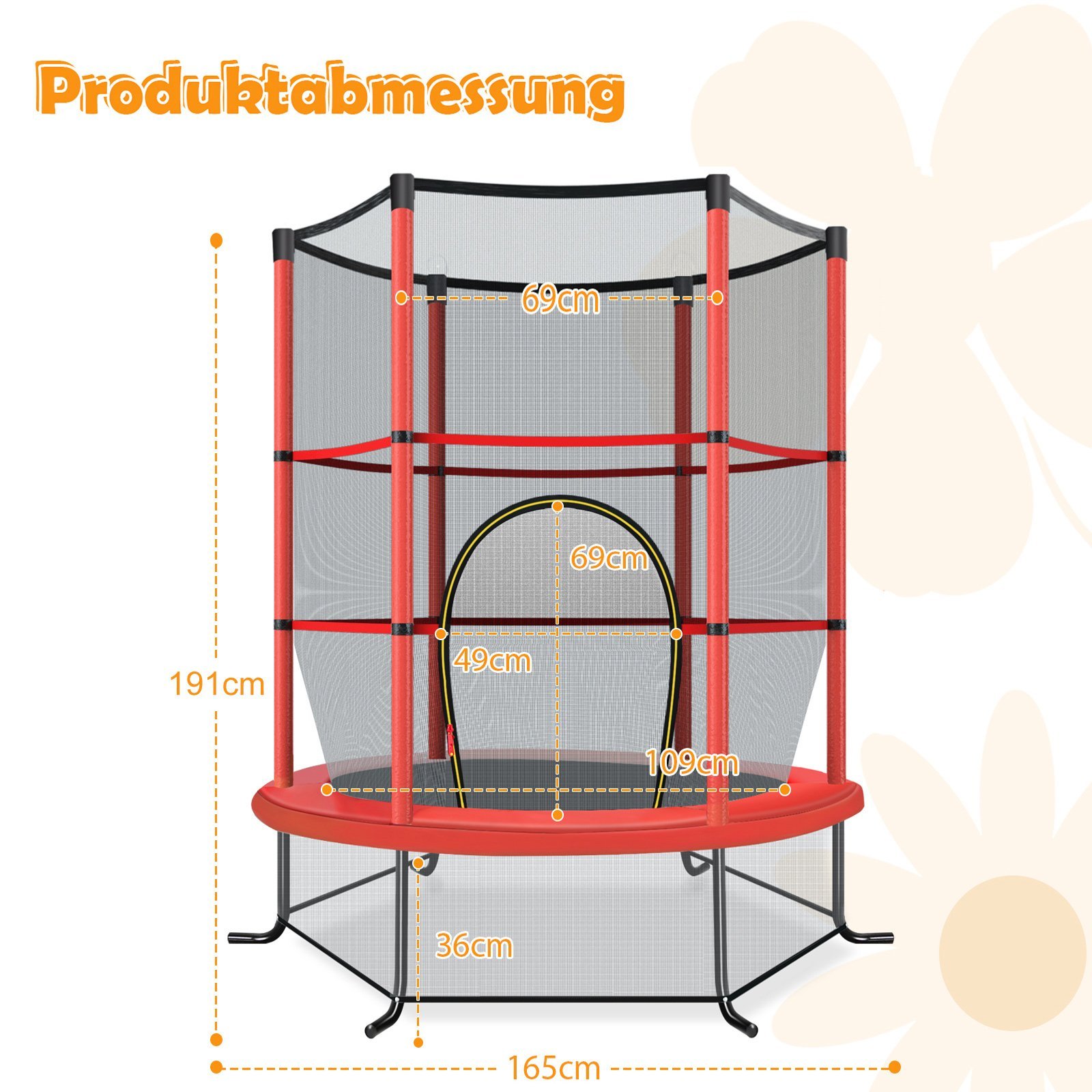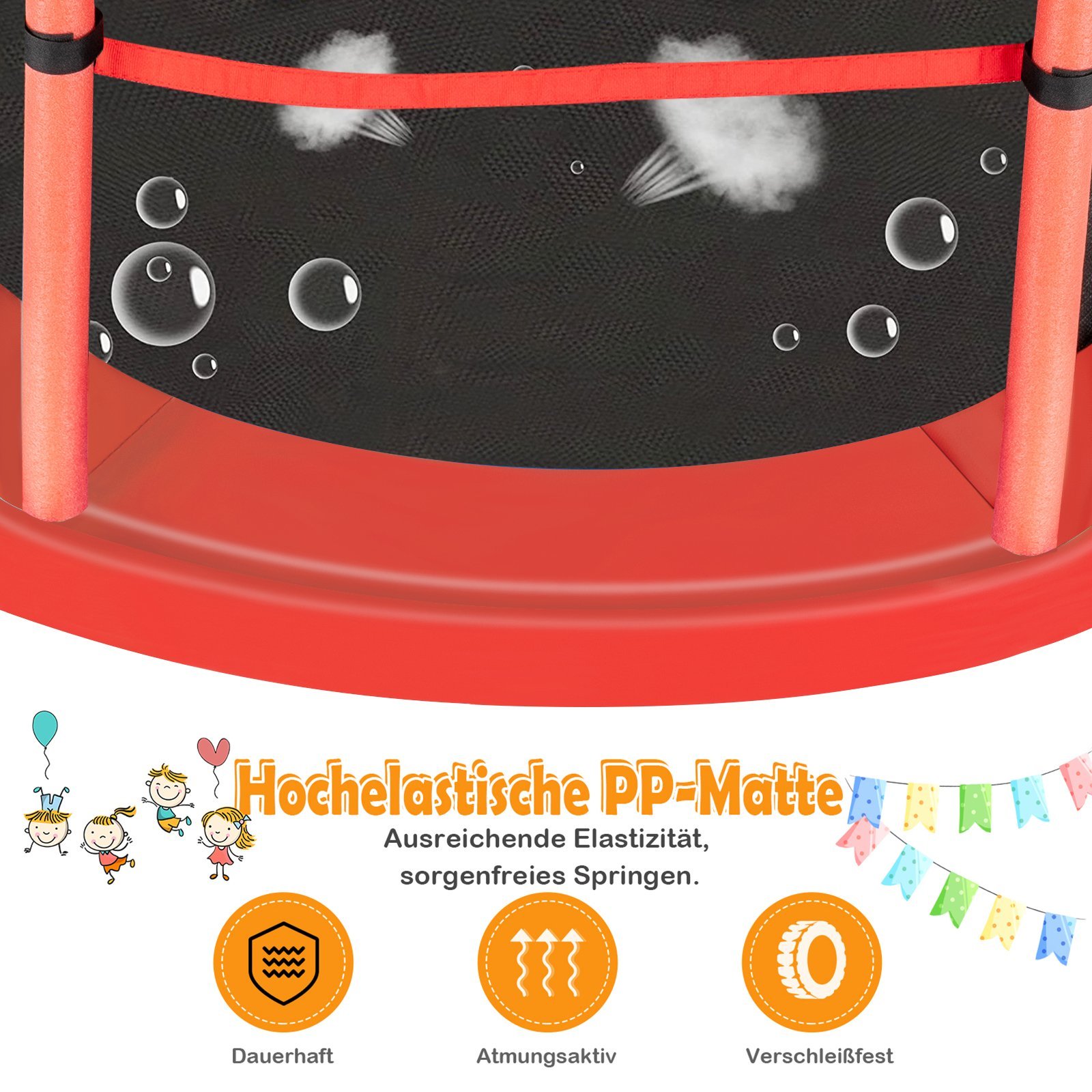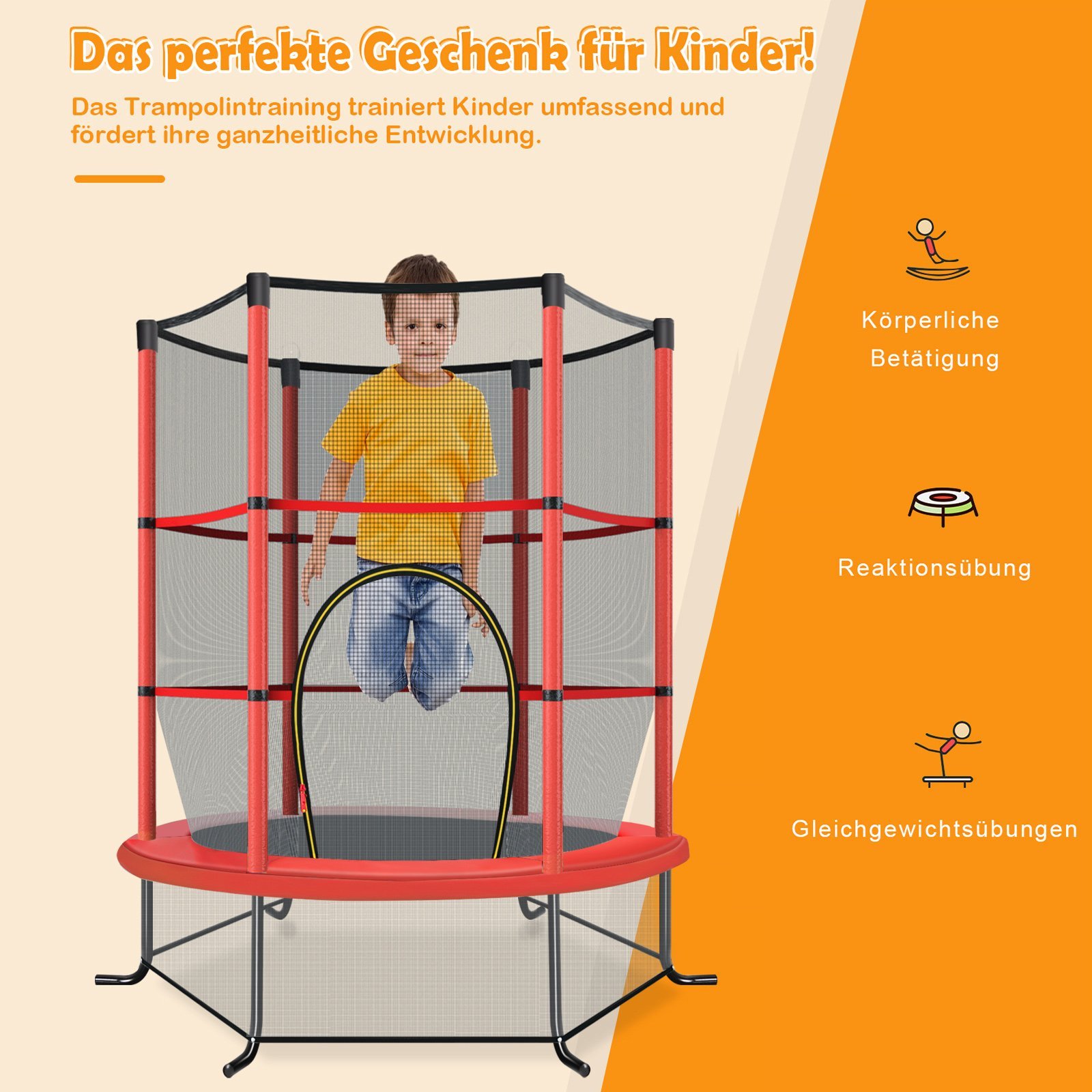 Šis batutas su visapusišku apsauginiu tinklu ir tvirtu rėmu užtikrina maksimalų Jūsų vaikų saugumą. Plieniniai strypai, padengti minkšta EPE putplasčio danga, apsaugo nuo sužalojimų, o keturios išlenktos kojos garantuoja stabilumą. Su 30 itin elastingų virvių ir puikia atšokimo galimybe, batutas skatina vaikų pusiausvyrą ir koordinaciją. Dėl kompaktiško dydžio jis puikiai tinka naudoti tiek viduje, tiek lauke.