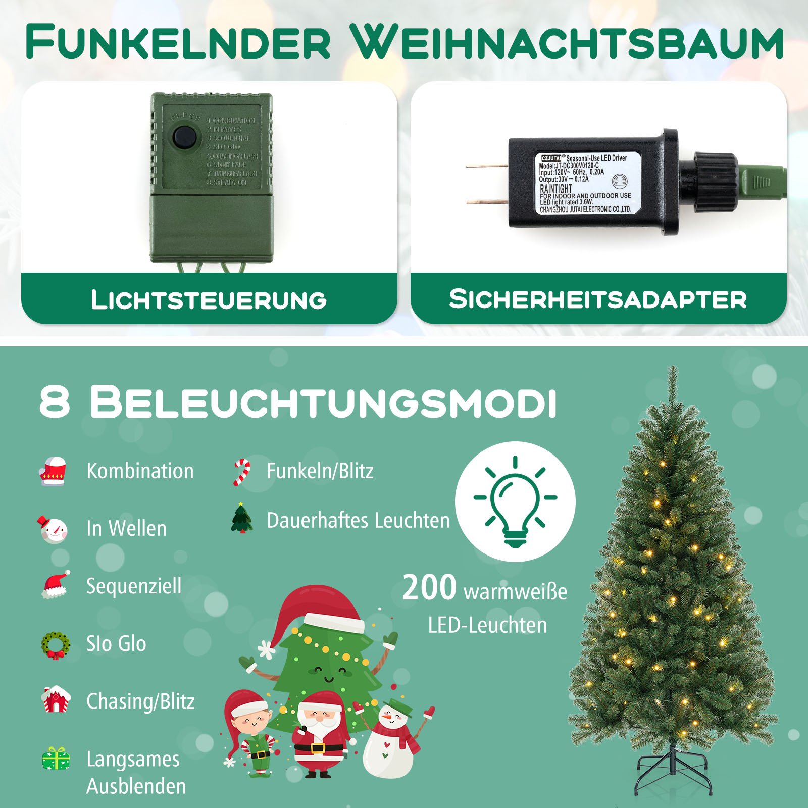 - 200 šiltai baltų LED lempučių su 8 skirtingais apšvietimo režimais, leidžiančiais sukurti tobulą atmosferą.
