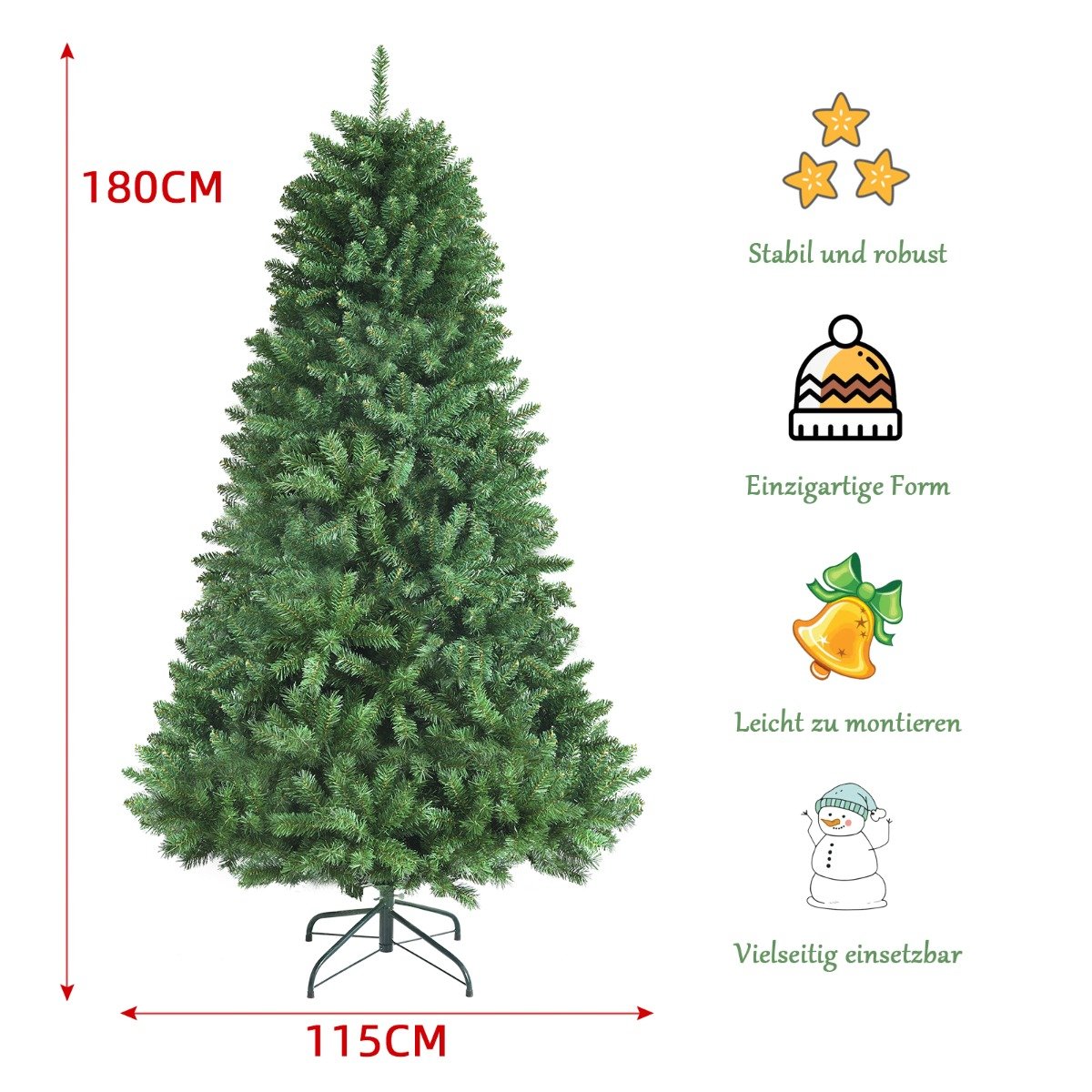 Sukurkite stebuklingą šventinę atmosferą su šia 180 cm aukščio dirbtine eglute! Jos ypač tankios, 1130 šakų suteikia sodrią ir natūralią išvaizdą, o unikalus gėlės formos dizainas palieka daug vietos jūsų mėgstamiausiems papuošalams.