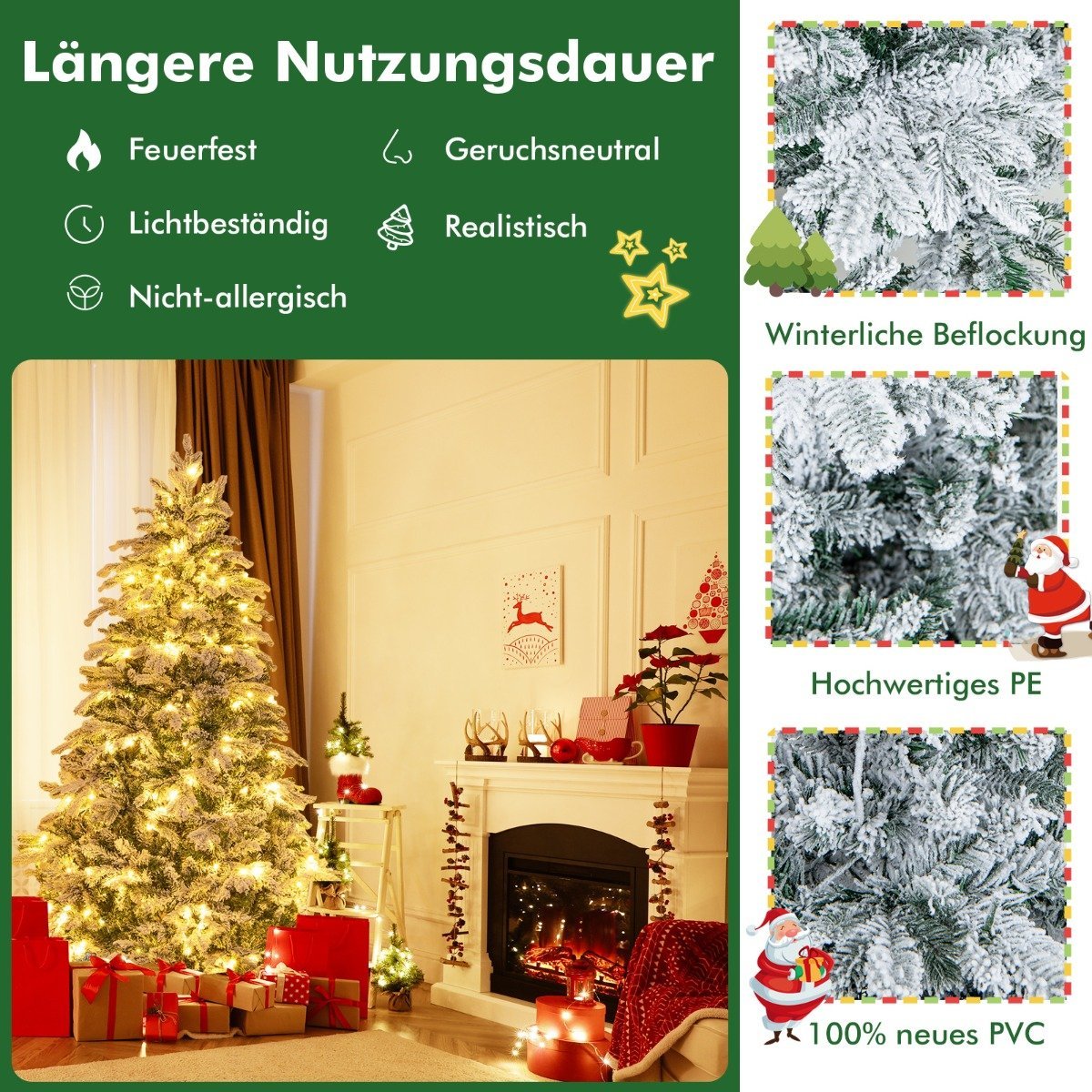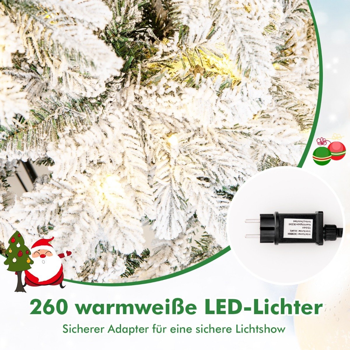 Papuoškite savo šventes šiuo kerinčiu, 180 cm aukščio Kalėdų eglutės modeliu. 260 LED lempučių, skleidžiančių šiltą, baltą šviesą, sukuria saugią ir žavingą atmosferą. Šios lemputės veikia žema įtampa ir yra energiją taupančios.