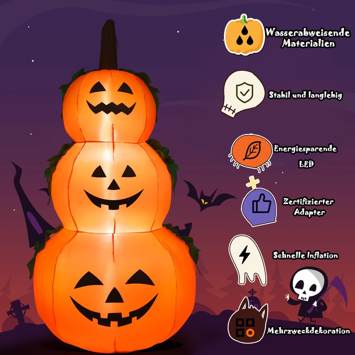 Artėjant Helovino šventei, pasiruoškite savo namus originalia ir šventiška dekoracija! Šis pripučiamas moliūgų dekoras sukurs nepakartojamą atmosferą jūsų sode ar namuose.