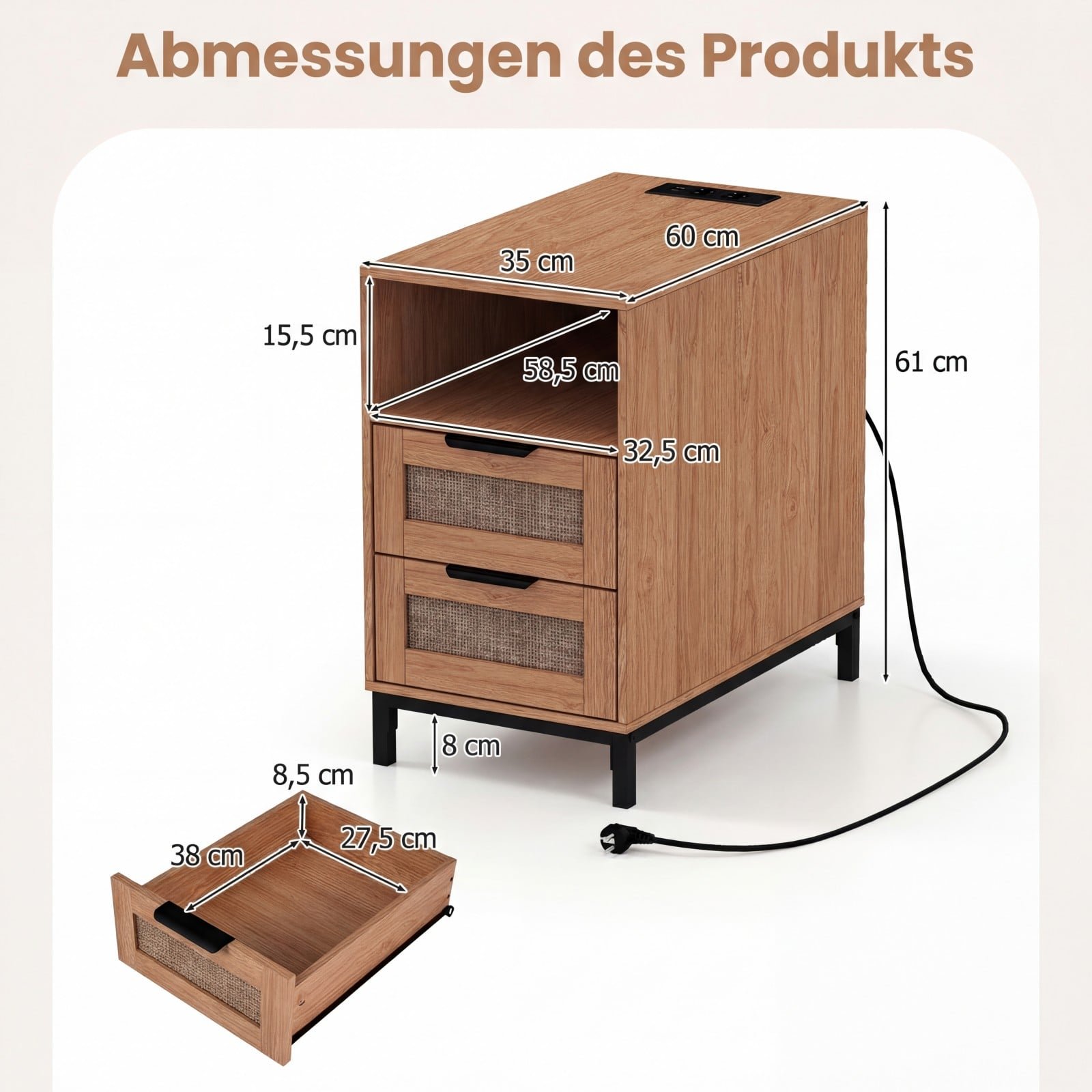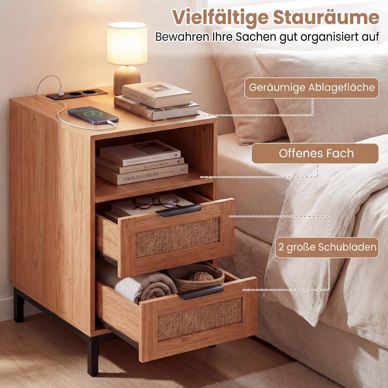 2 dalių naktinių staliukų komplektas su integruota įkrovimo stotele ir ratanu (Natūrali ir juoda)
