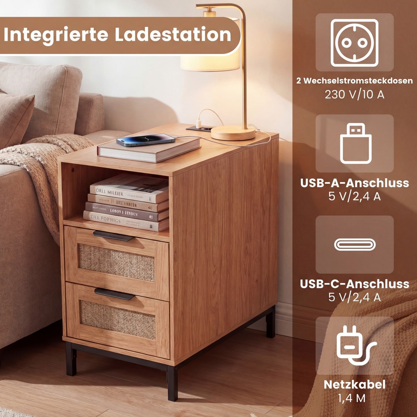 Įneškite tvarkos ir elegancijos į savo namus su šiuo išskirtiniu naktiniu staliuku iš PE ratano su integruota įkrovimo stotele. Meistriškai pinto PE ratano ir medienos derinys suteiks jūsų erdvei šiuolaikiškumo ir jaukumo, puikiai įsiliedamas į svetainės ar miegamojo interjerą. Funkcionalus dizainas užtikrina patogų prietaisų įkrovimą, o erdvios daiktų laikymo vietos padeda palaikyti tvarką.