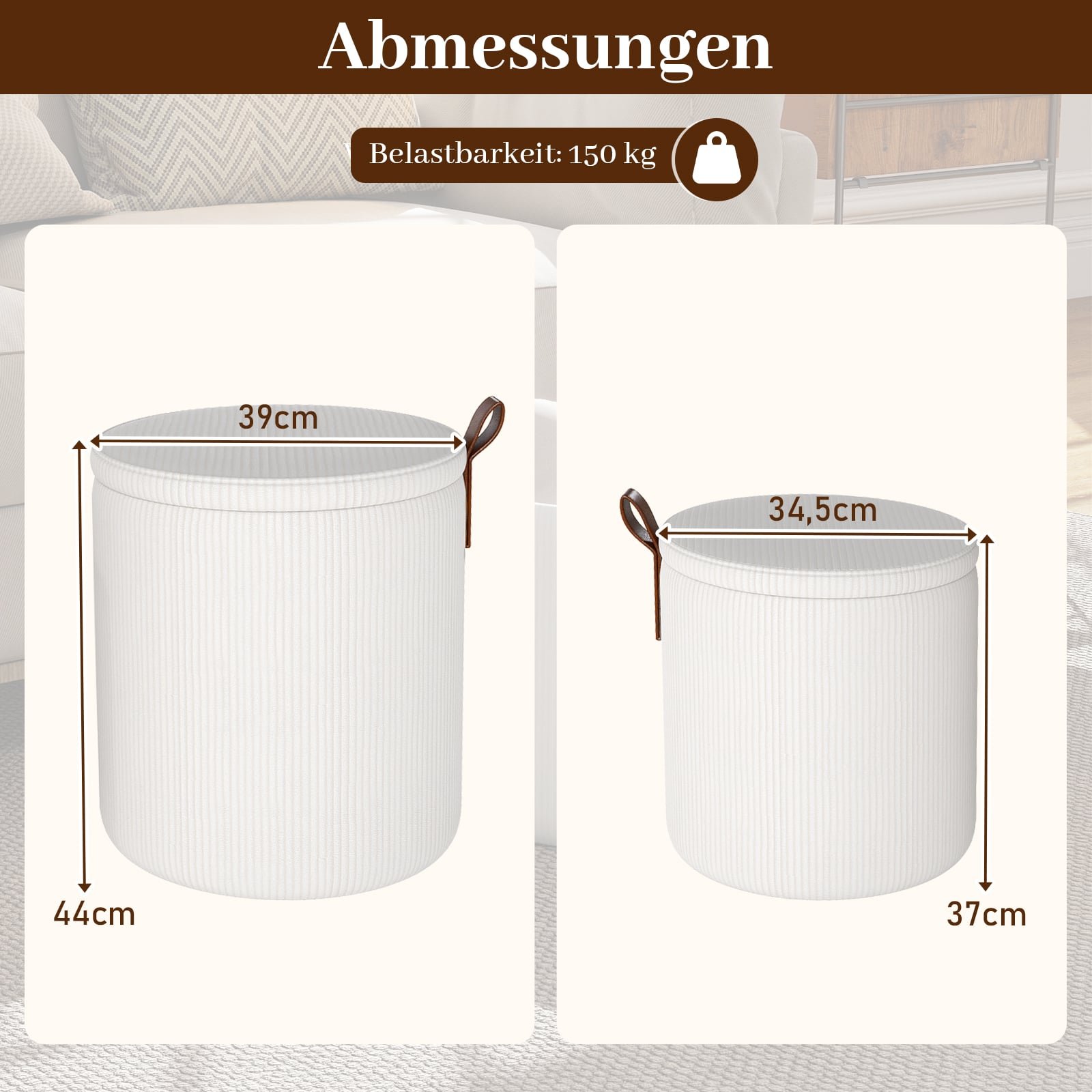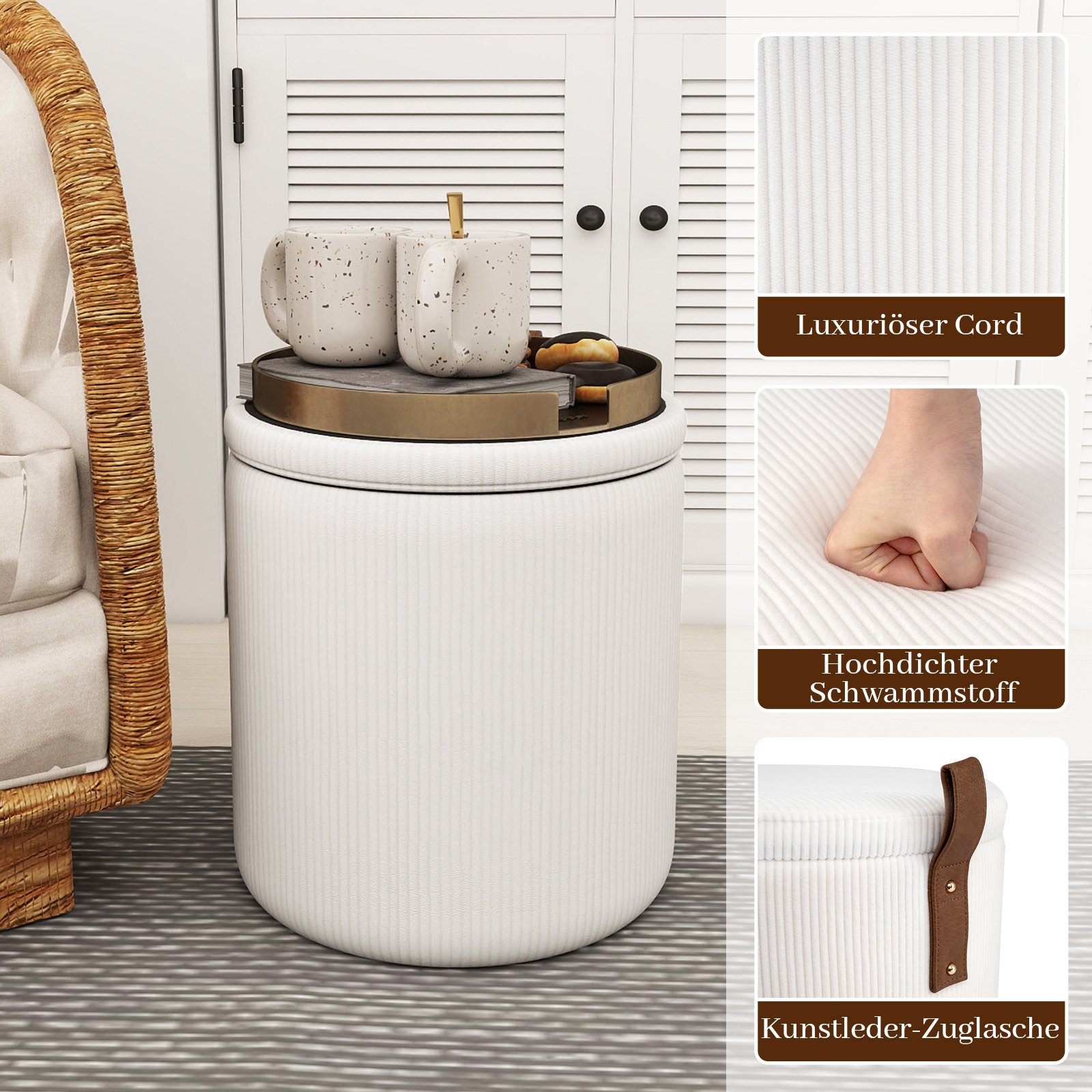 2 vnt. Apvalūs įstatomi pufai su paslėpta saugykla (Balta)