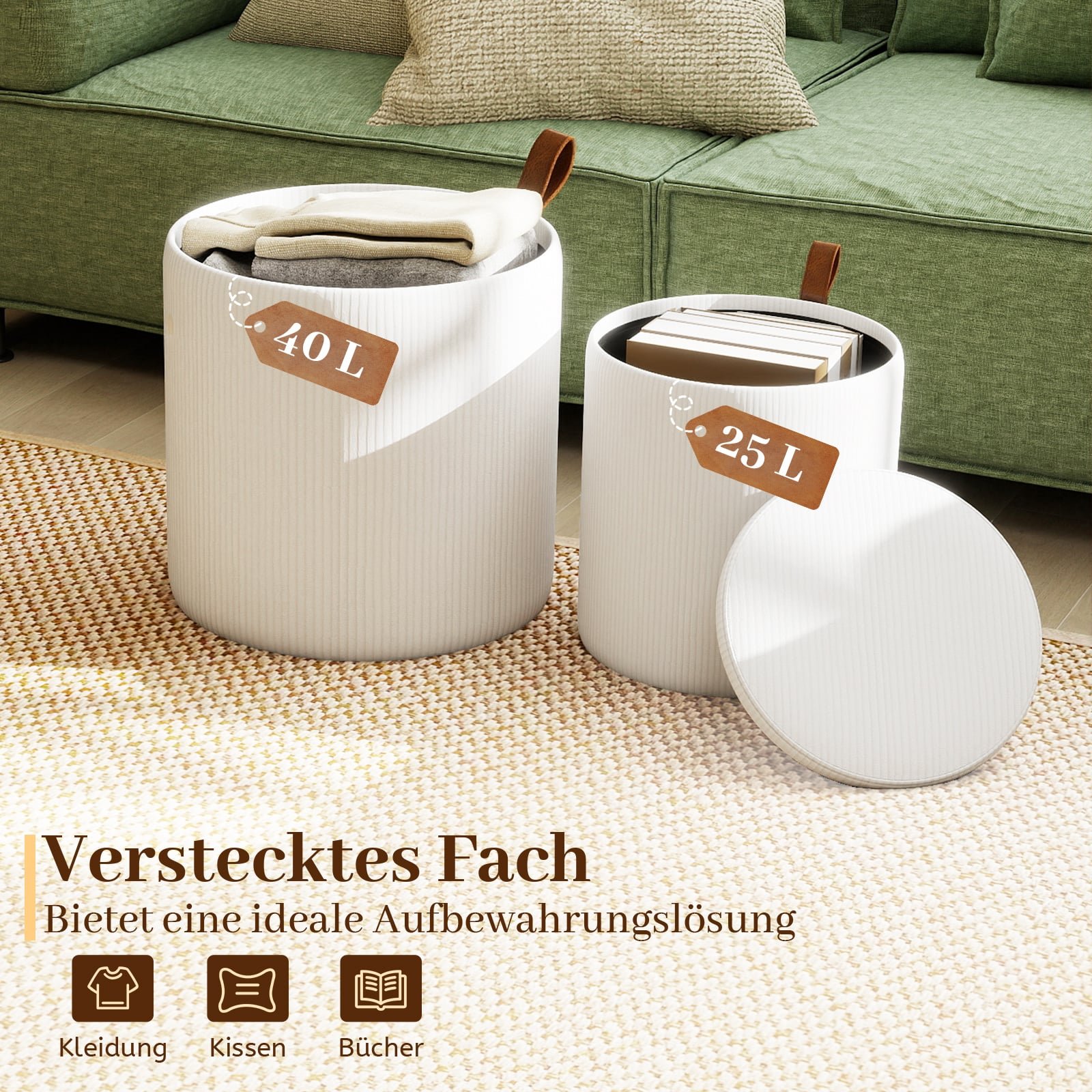 Šis dviejų pufų komplektas siūlo tiek paslėptą daiktadėžę, tiek neprilygstamą komfortą. Aptraukti minkštu kordiniu audiniu ir paminkštinti didelio tankio putplasčiu, šie pufai puikiai derina eleganciją su funkcionalumu. Lengvai nuimami dangčiai su dirbtinės odos rankenėlėmis suteikia patogią prieigą prie vidinių skyrių, o jų vienas į kitą įstatomas dizainas padeda maksimaliai išnaudoti erdvę. Jie idealiai tinka kaip papildoma sėdimoji vieta, patogi kojų atrama, praktiškas staliukas ar daiktadėžė prieškambaryje, miegamajame ar svetainėje.