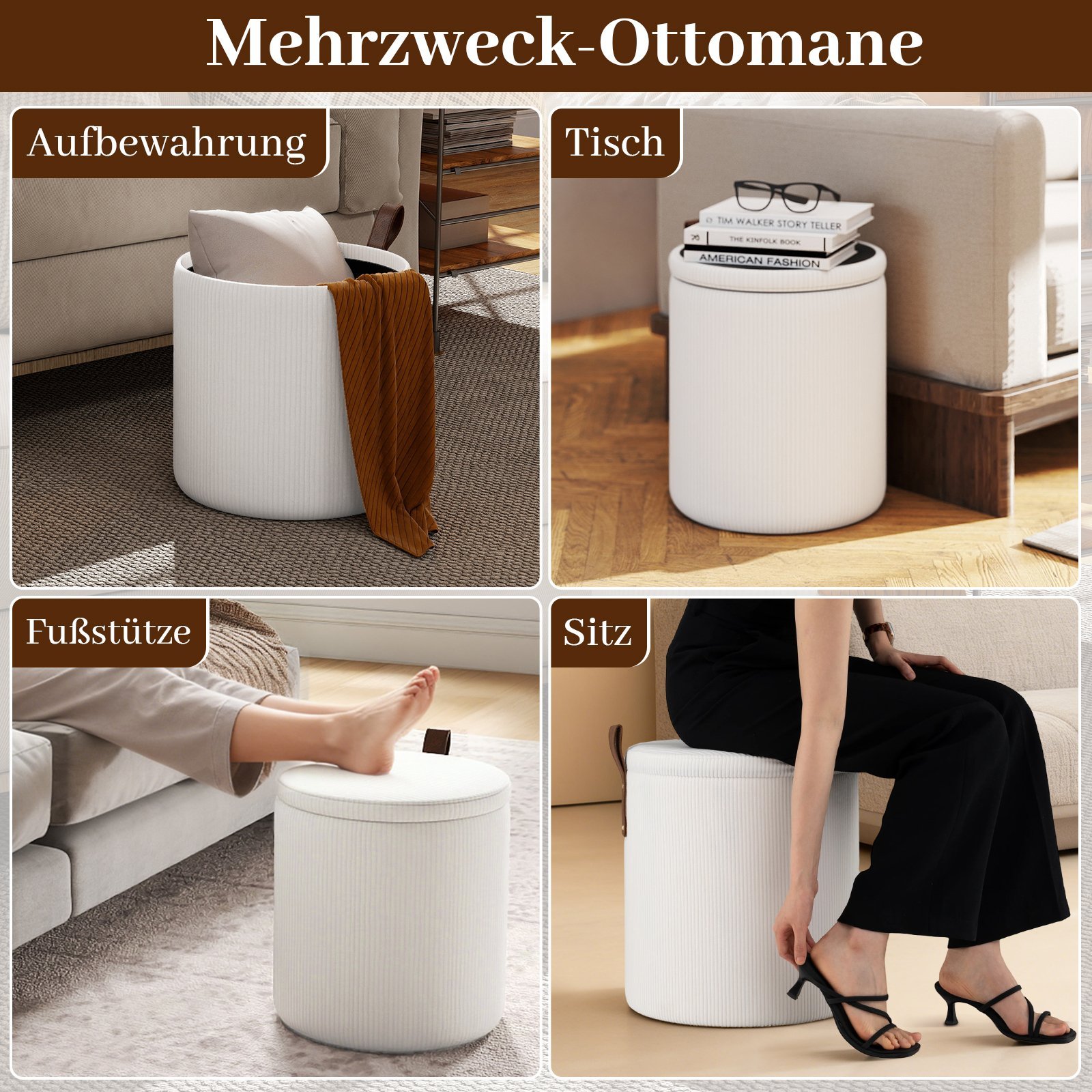 - Daugiafunkcinis dizainas: gali būti naudojami kaip sėdimoji vieta, kojų atrama, staliukas ar papildoma daiktadėžė.