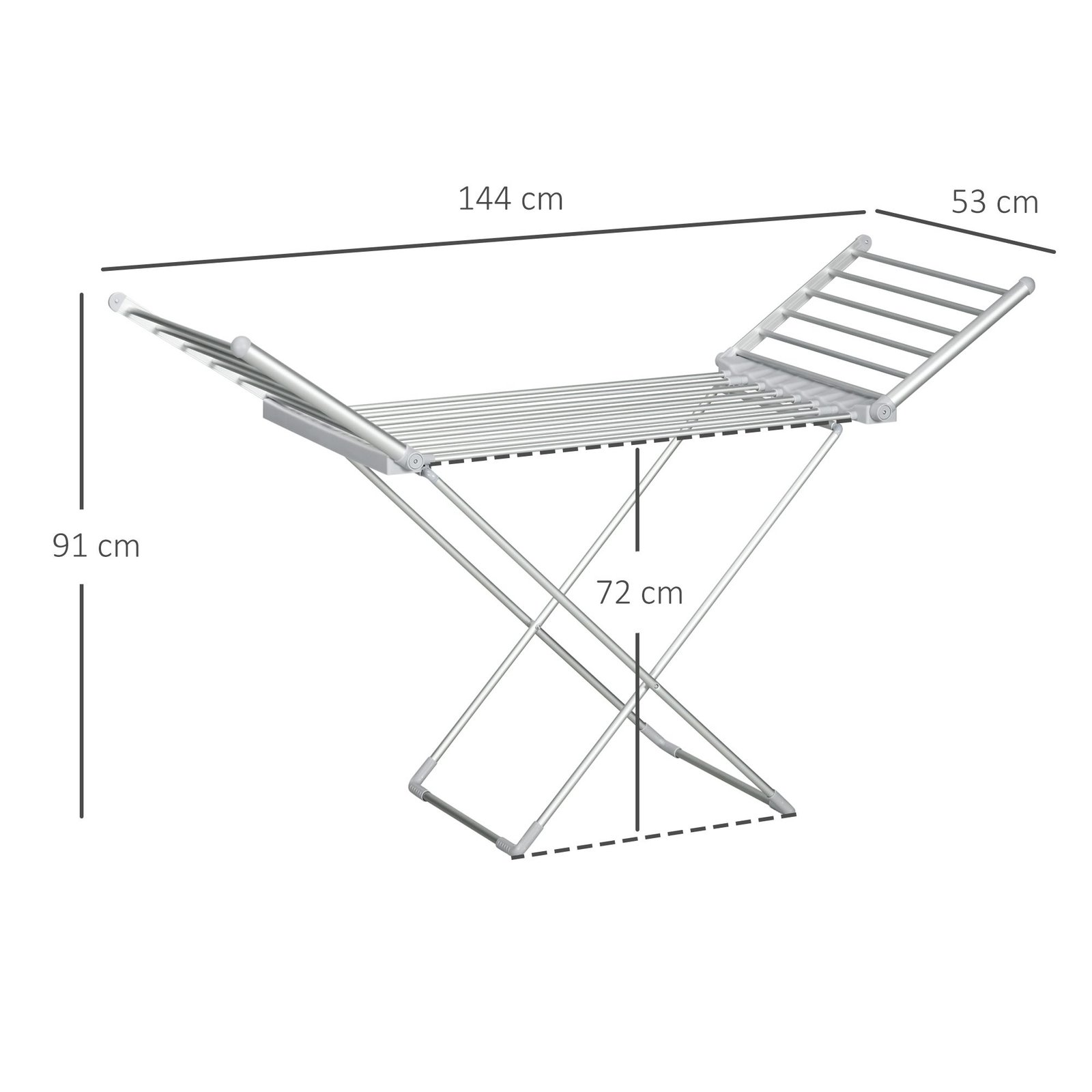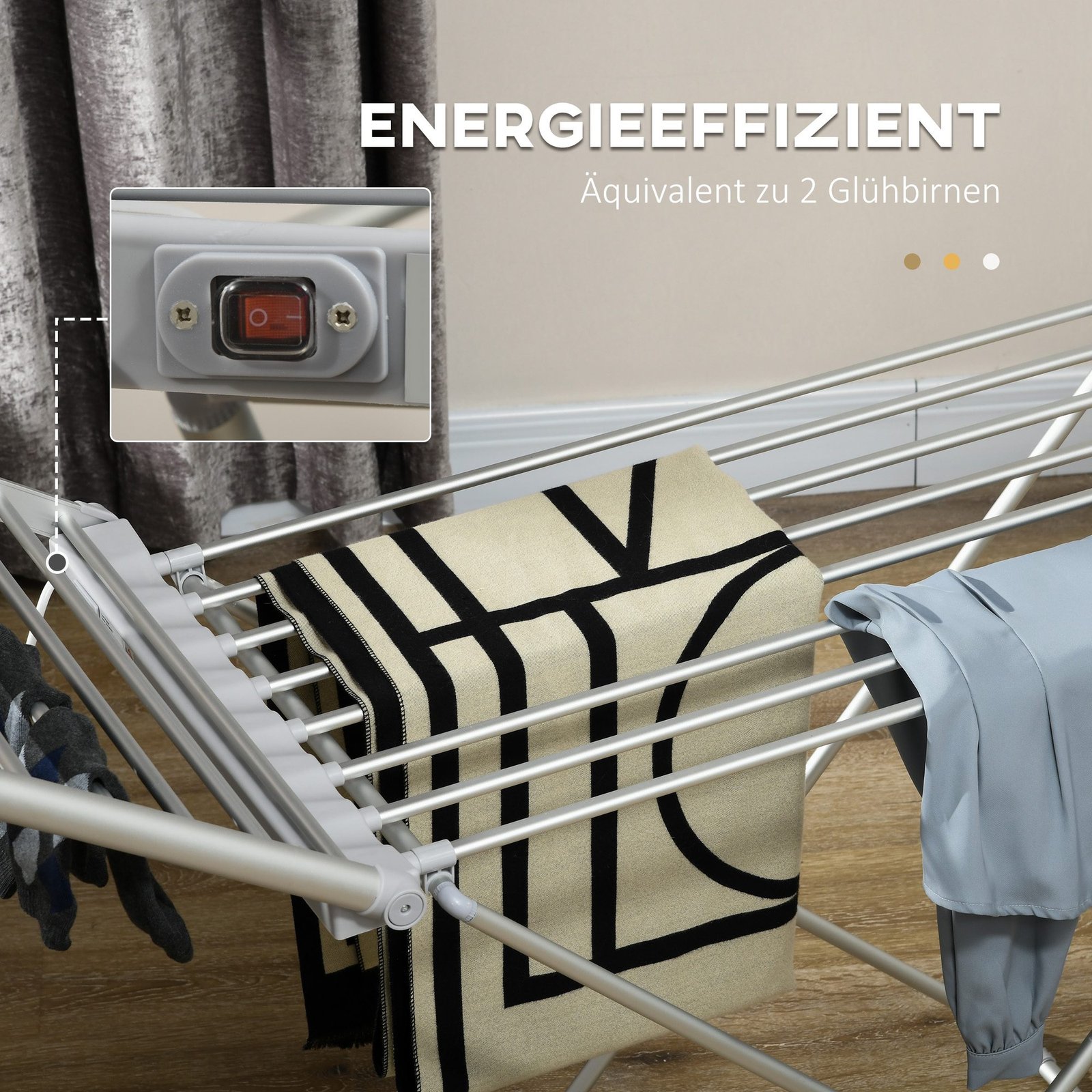 Su šia šildoma elektrine 230 W drabužių džiovykle sutaupysite brangaus džiovinimo laiko! Su šia šildoma elektrine drabužių džiovykle jūsų drabužiai išdžius greitai, net ir uždarose patalpose. 45-55°C temperatūra šildo ir džiovina jūsų skalbinius jų nepažeisdama, o drabužių džiovyklė sunaudoja mažai energijos.
