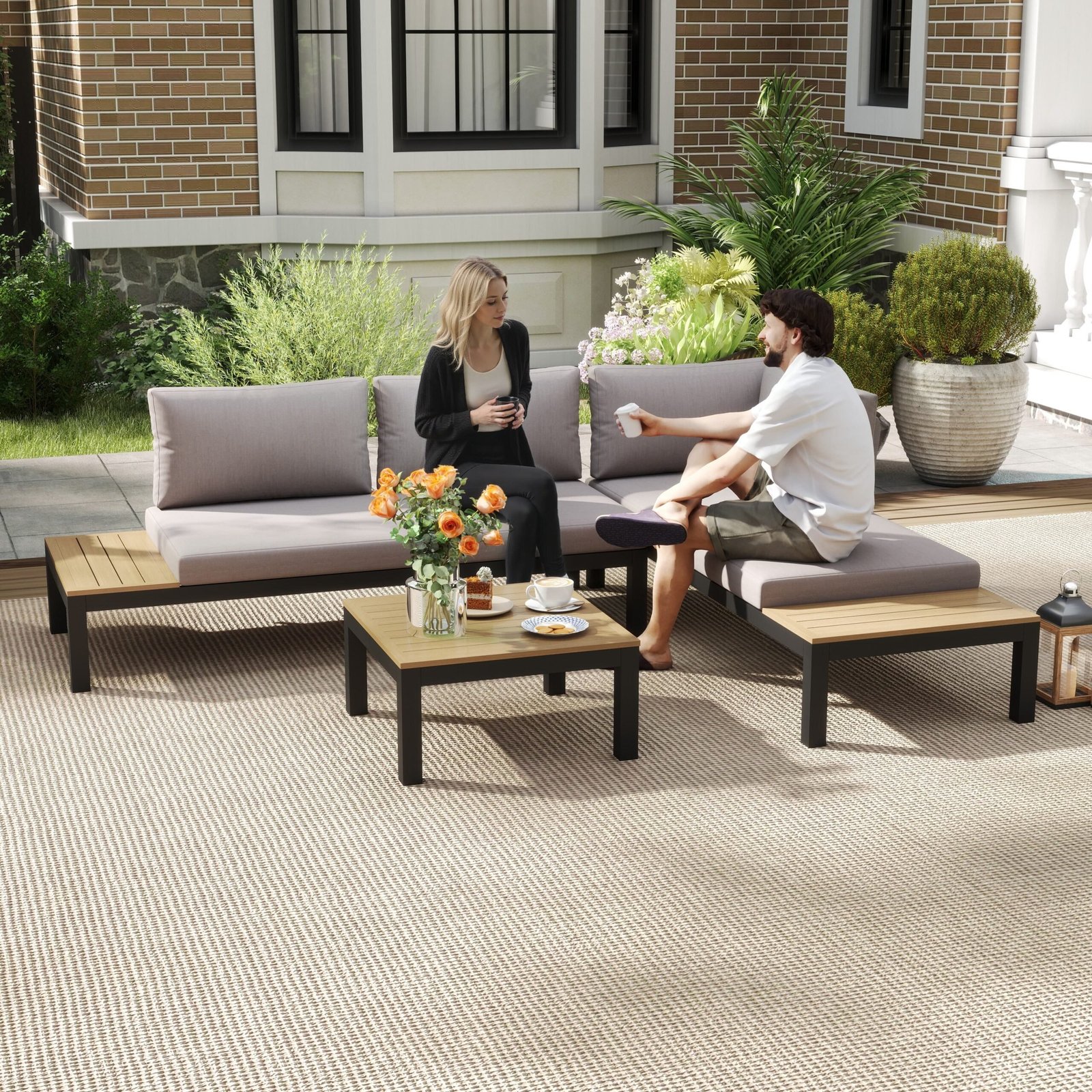 Su šiuo trijų dalių sodo baldų komplektu galėsite vėl susikoncentruoti į esminius dalykus. Aliuminio rėmas užtikrina ilgaamžiškumą ir tvirtumą, yra atsparus rūdims ir lengvas, todėl viską galite lengvai transportuoti. Storai paminkštintos sėdynės ir nugaros pagalvėlės užtikrina patogų sėdėjimą, o kavos staliukas su lentjuosčių raštu ir šoninis padėklas ant sofos suteikia daug vietos daiktams ir yra lengvai valomi.