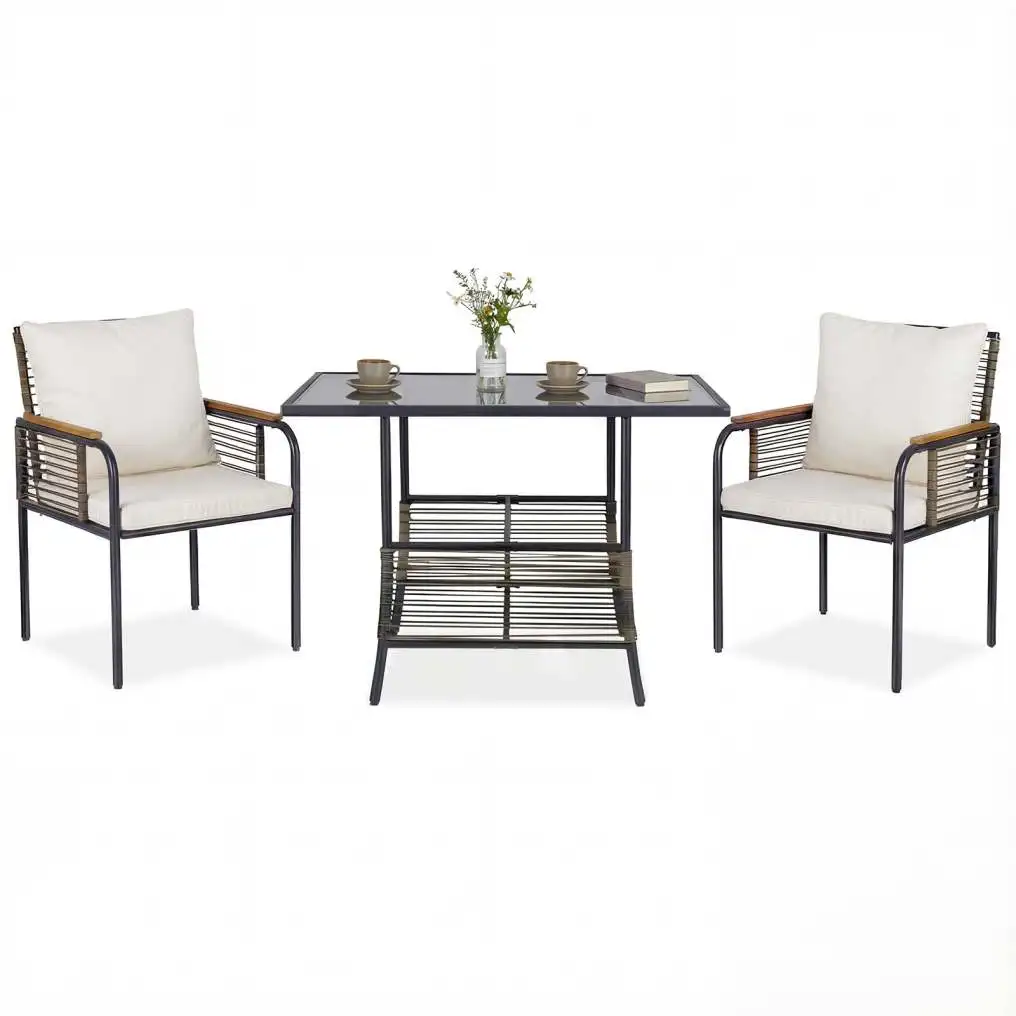 Atnaujinkite savo lauko erdvę su šiuo stilingu ir funkcionaliu 3 dalių bistro komplektu. Pagamintas iš saulės spinduliams atsparaus PE ratano ir pasižymintis kruopščiu rankų darbo pynimu, šis komplektas užtikrina ilgaamžiškumą bei suteikia elegancijos jūsų sodui ar terasai. Minkštos ir storos pagalvėlės garantuoja išskirtinį komfortą, idealiai tinkantį atsipalaiduoti, mėgautis valgiu ar jaukiems susitikimams. Be to, šis lauko baldų komplektas pasižymi apgalvotu dizainu, leidžiančiu kėdes patogiai įstumti po stačiakampiu stalu, taip efektyviai taupant vietą.