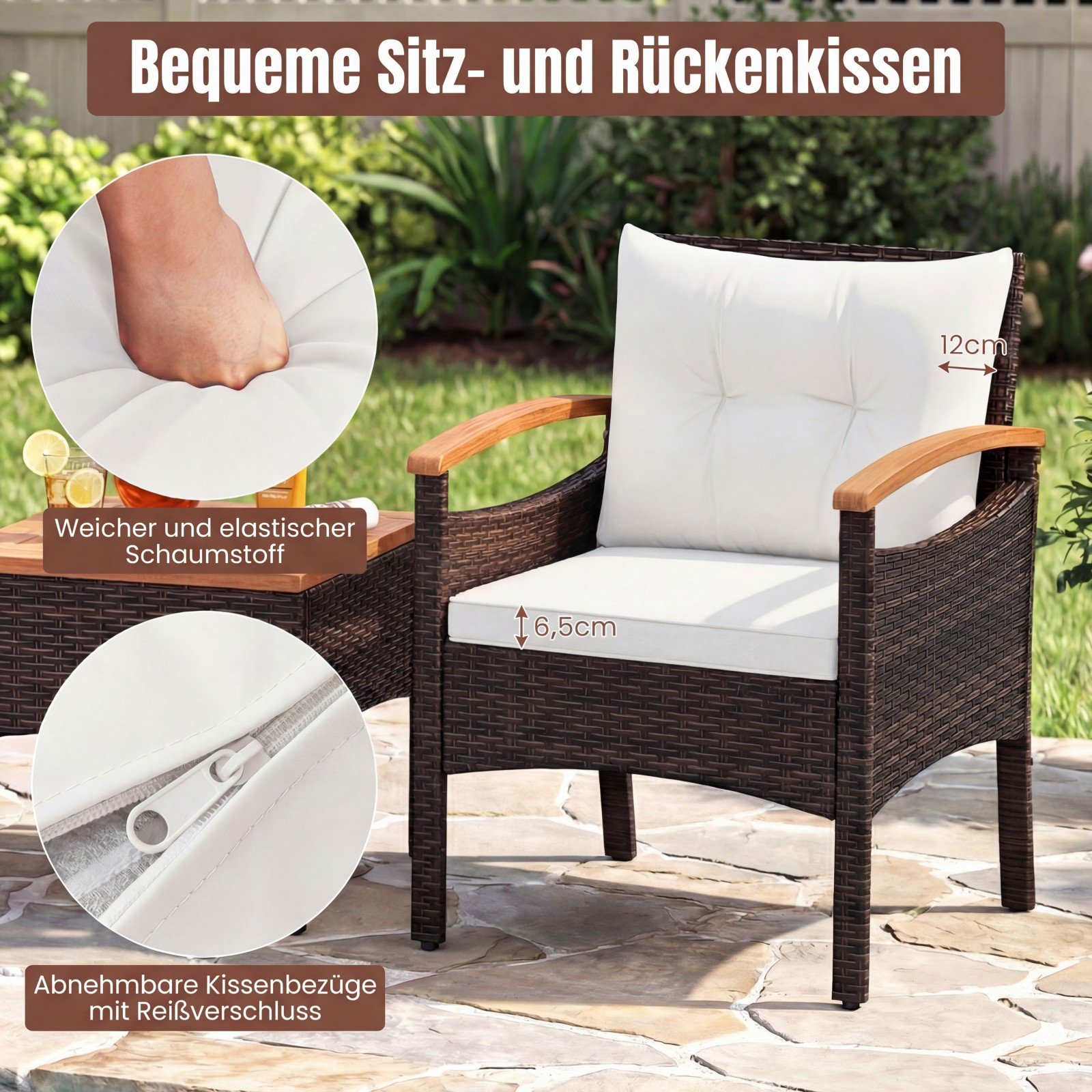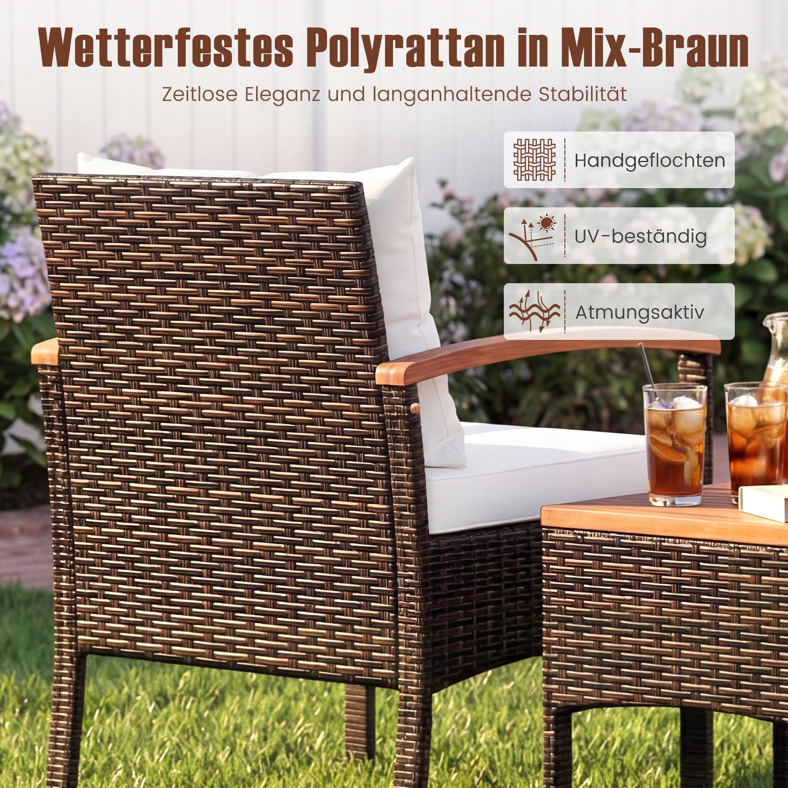 - Elegantiškas rankomis pintas PE ratano dizainas, atsparus oro sąlygoms ir UV spinduliams, užtikrinantis ilgalaikę estetiką.