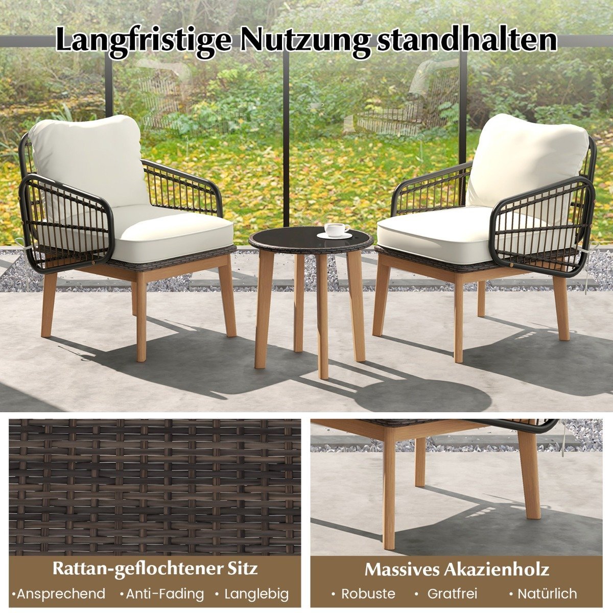 - Medžiaga: PE rotangas, akacijos mediena, metalas, grūdintas stiklas, poliesteris, kempinė