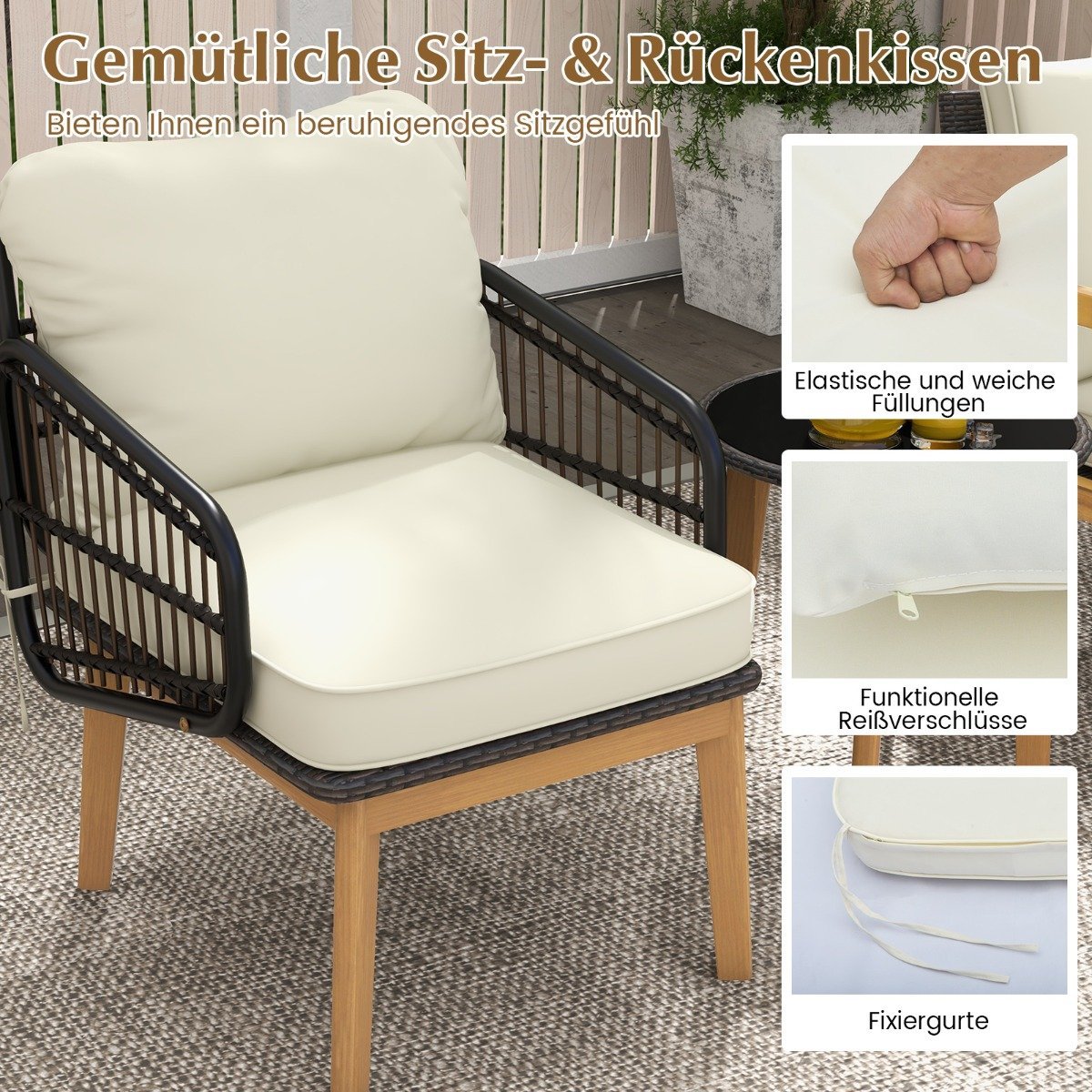 - Aukštos kokybės PE rotango pynimas – atsparus blukimui ir ilgaamžis.