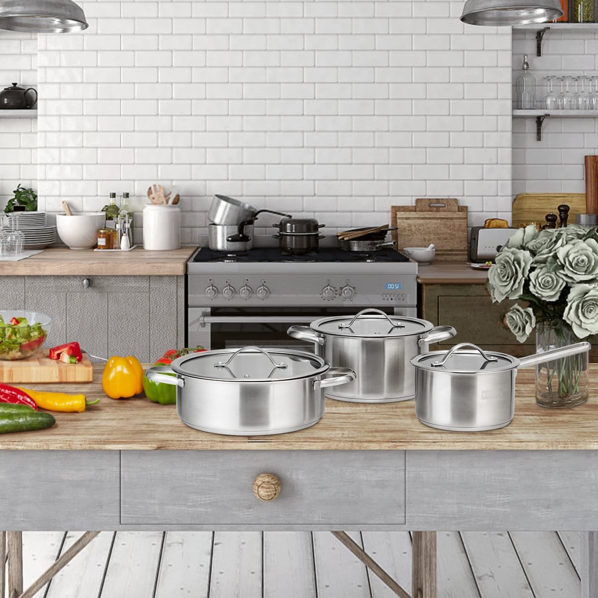Šis 3 skirtingų dydžių puodų rinkinys – praktiškas pasirinkimas bet kuriems namams. Pagamintas iš aukštos kokybės nerūdijančio plieno ir grūdinto stiklo, jis užtikrina ilgaamžiškumą ir saugų naudojimą.