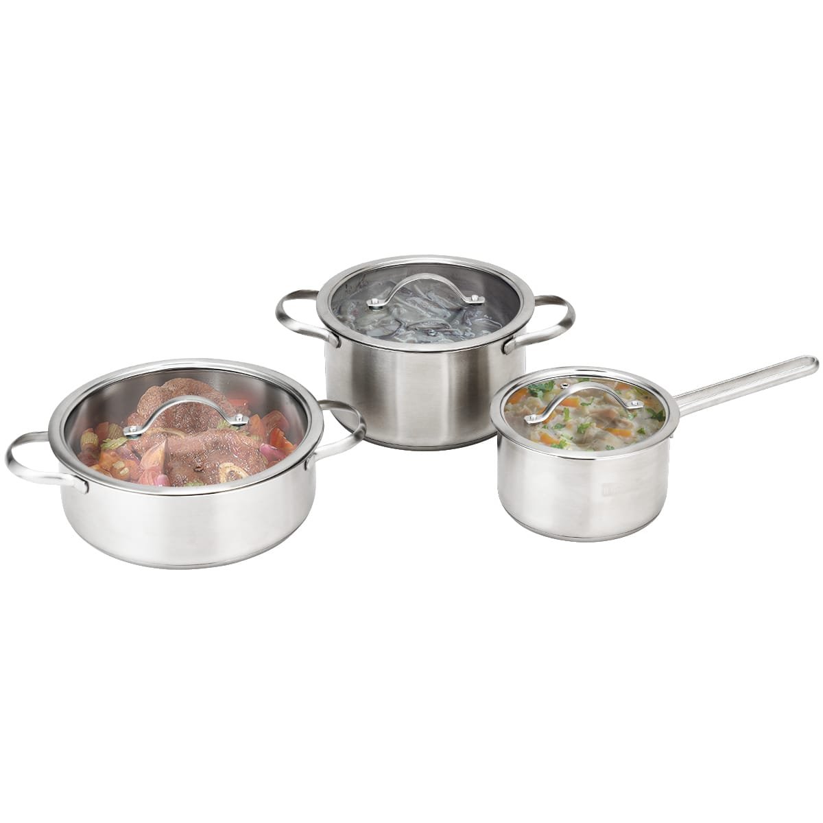 3 dalių nerūdijančio plieno puodų rinkinys su stikliniais dangčiais (Sidabrinė)