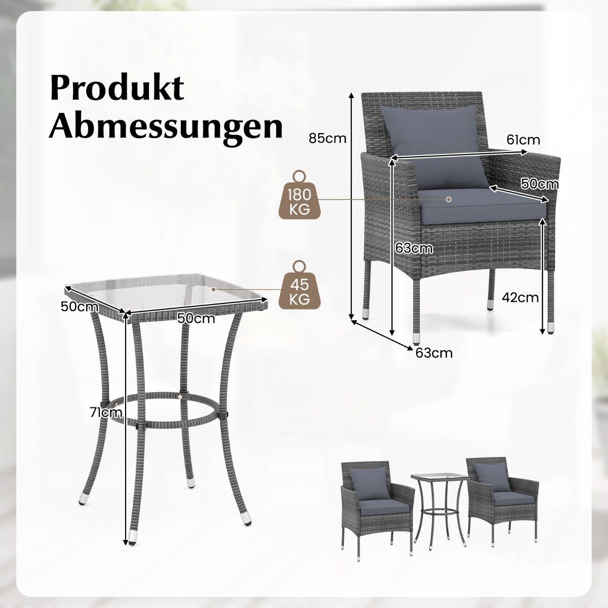 3 dalių poliratano sodo baldų komplektas su stalu ir pagalvėmis (Pilka)