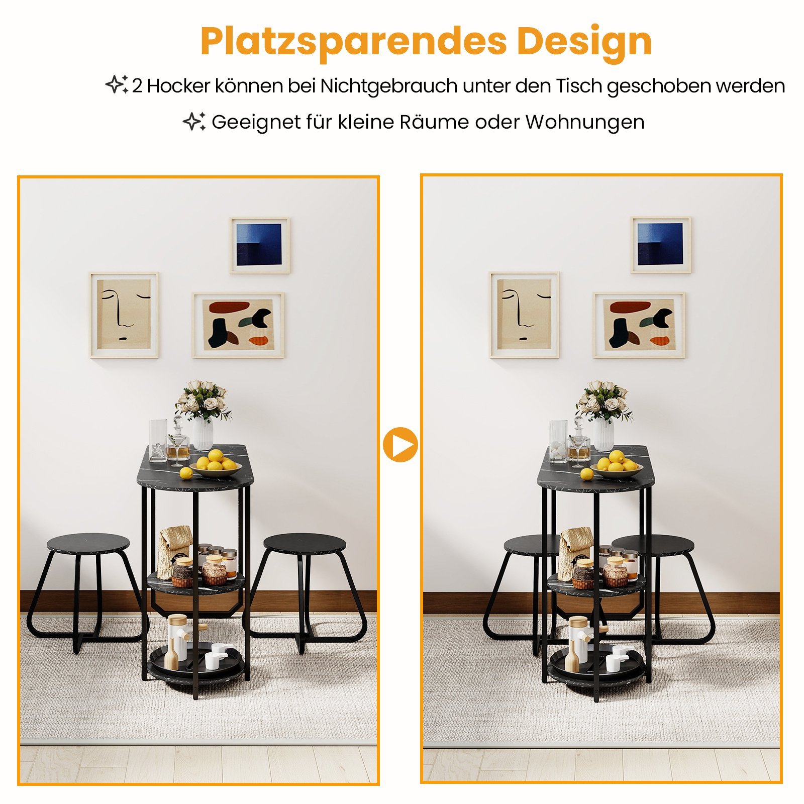- Erdvus 3 dalių komplektas su stalu ir 2 kėdėmis, puikiai tinkantis poroms ar mažoms šeimoms.