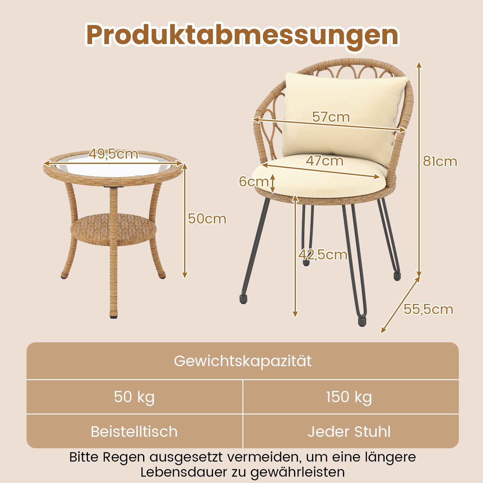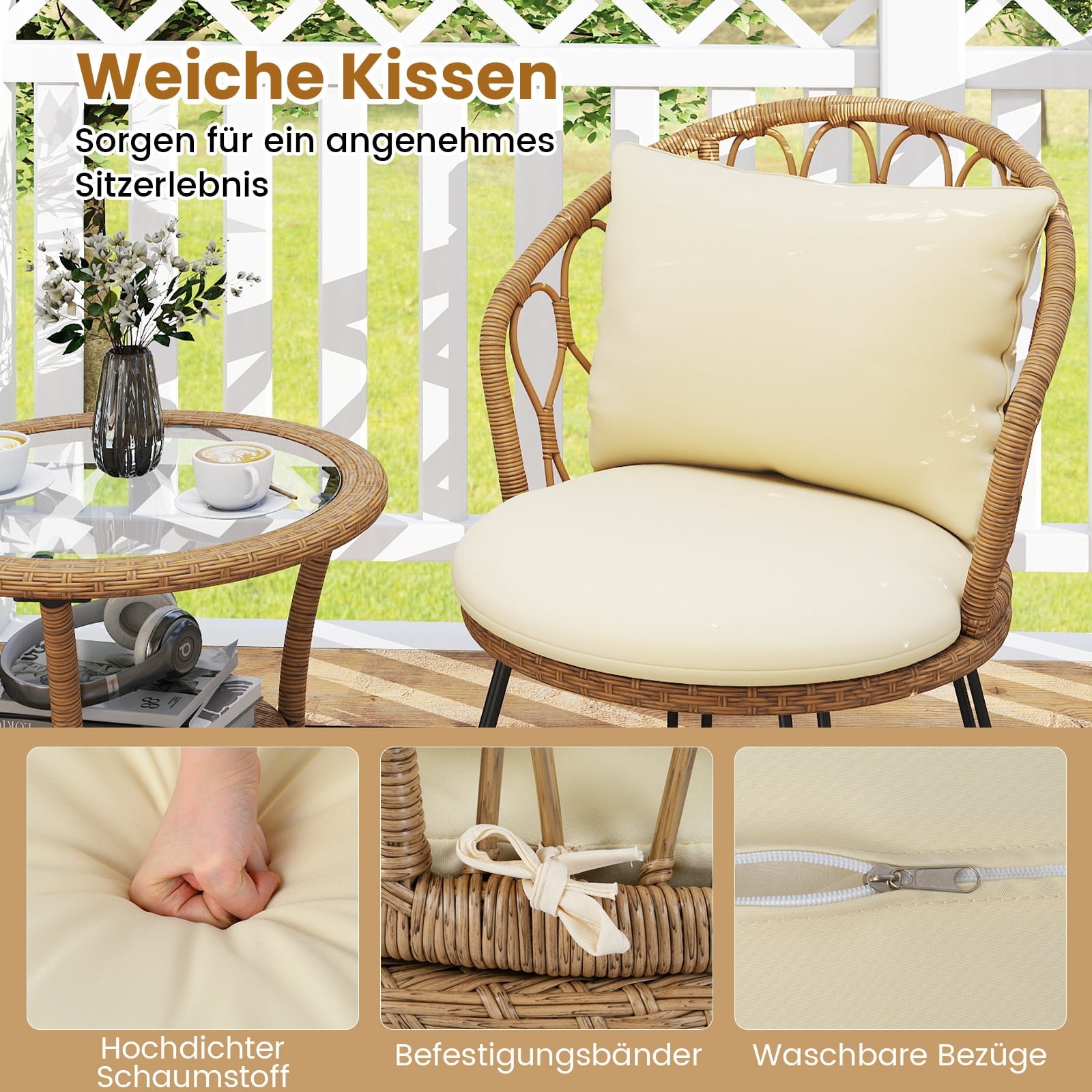 3 dalių ratano bistro rinkinys su pagalvėlėmis ir dviejų aukštų stalu (Smėlio)