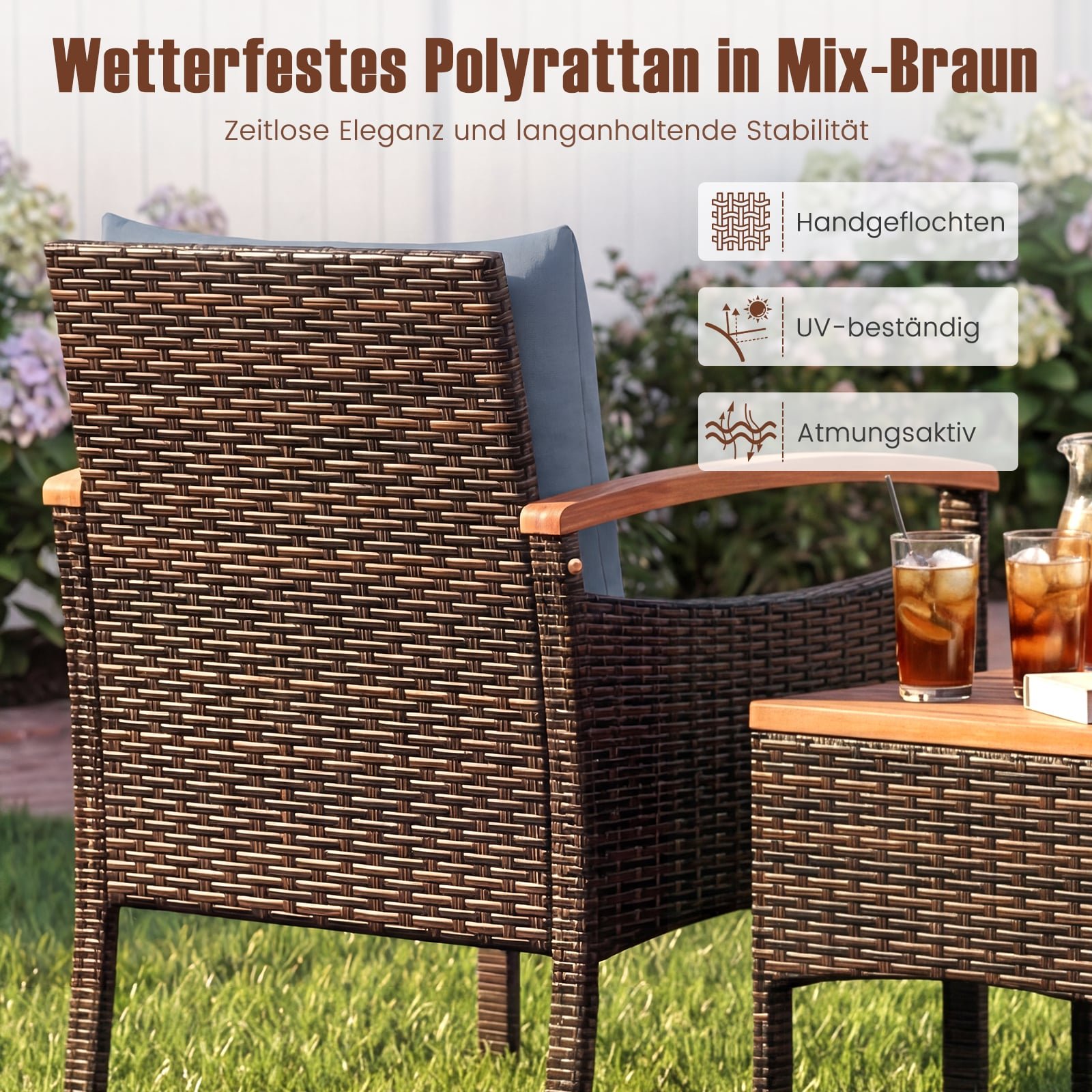 Paverskite kiekvieną akimirką lauke malonesne su šiuo elegantišku lauko baldų komplektu. Pagamintas iš oro sąlygoms atsparaus ir orui pralaidaus PE ratano, šis komplektas užtikrina ilgaamžiškumą ir stilingą išvaizdą. Jį papildo staliukas su akacijos medienos viršumi, idealiai tinkantis gėrimams ir užkandžiams, bei du minkštai paminkštinti krėslai, kviečiantys atsipalaiduoti.