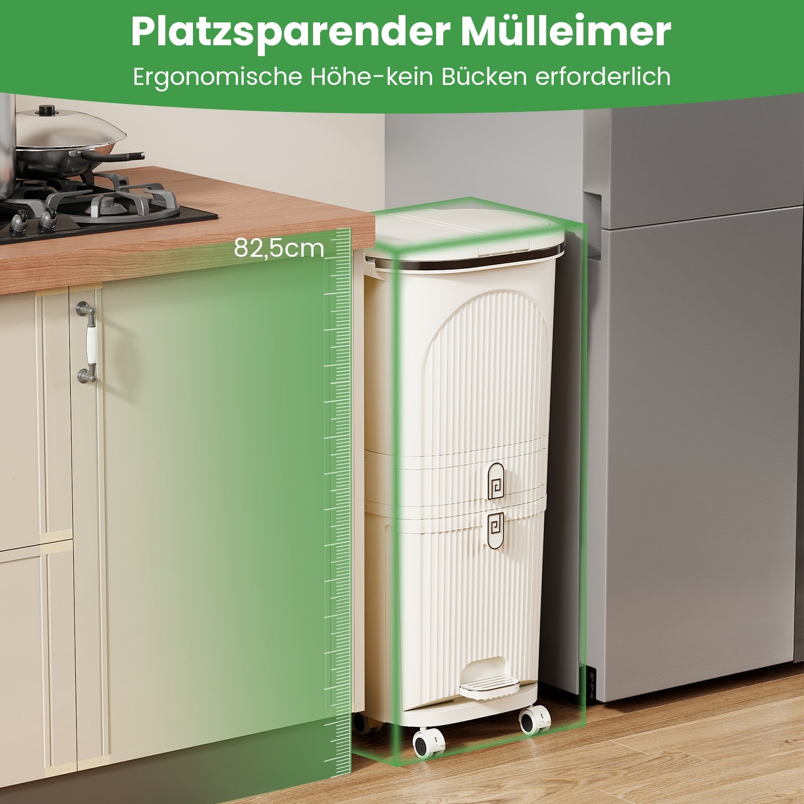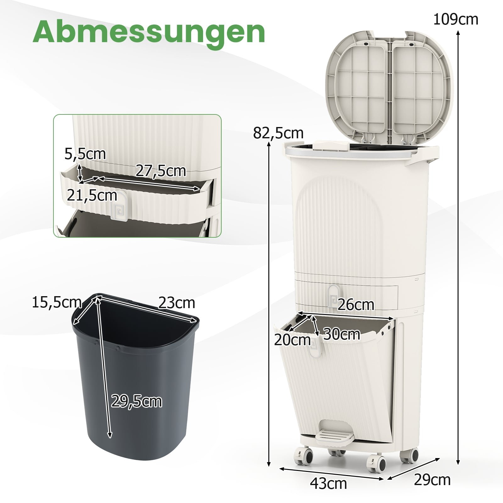 Ši moderni trijų lygių šiukšliadėžė leidžia lengvai ir efektyviai rūšiuoti atliekas, turėdama du 12 l talpos konteinerius ir vieną pakreipiamą 14 l skyrių, skirtą šlapioms, sausoms ir perdirbamoms atliekoms. Komplekte taip pat rasite praktiškus ženklinimo lipdukus. Be to, šiukšliadėžėje integruotas 4 l talpos vidurinis stalčius smulkiems daiktams ir šoninės rankenos, kurias galima naudoti kaip kabliukus daugkartiniams maišeliams ar rankšluosčiams pakabinti. Patogūs dangteliai su paspaudimo mechanizmu ir kojinis pedalas užtikrina higienišką naudojimą, nereikalaujantį rankų prisilietimo.