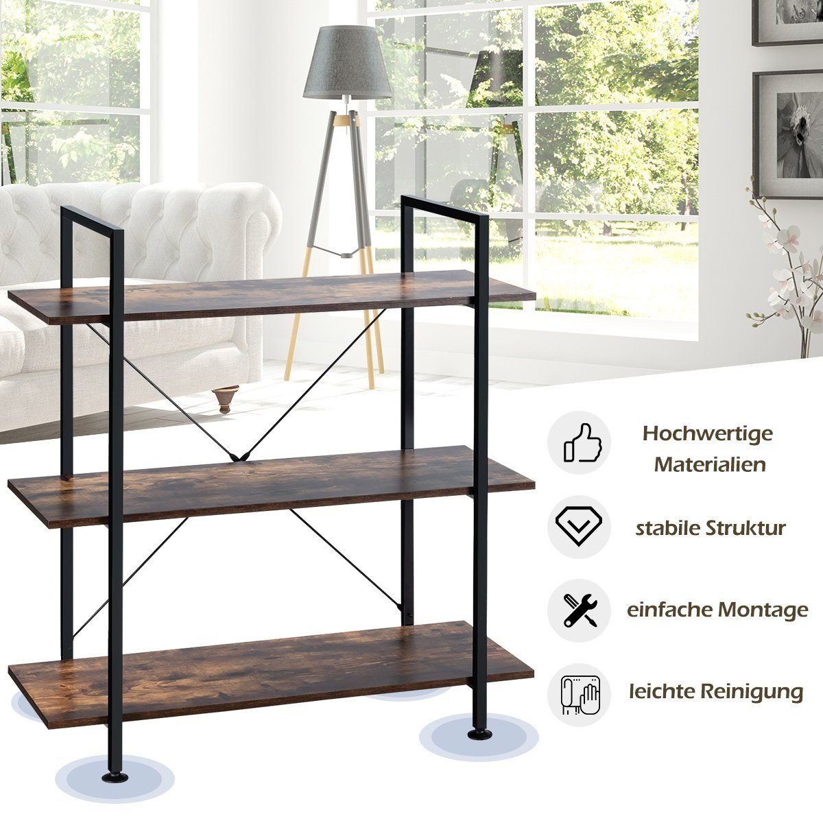 - Didelė laikymo talpa: 3 atviros lentynos suteikia pakankamai vietos knygoms, vazoniniams augalams ar dekoratyviniams daiktams laikyti.