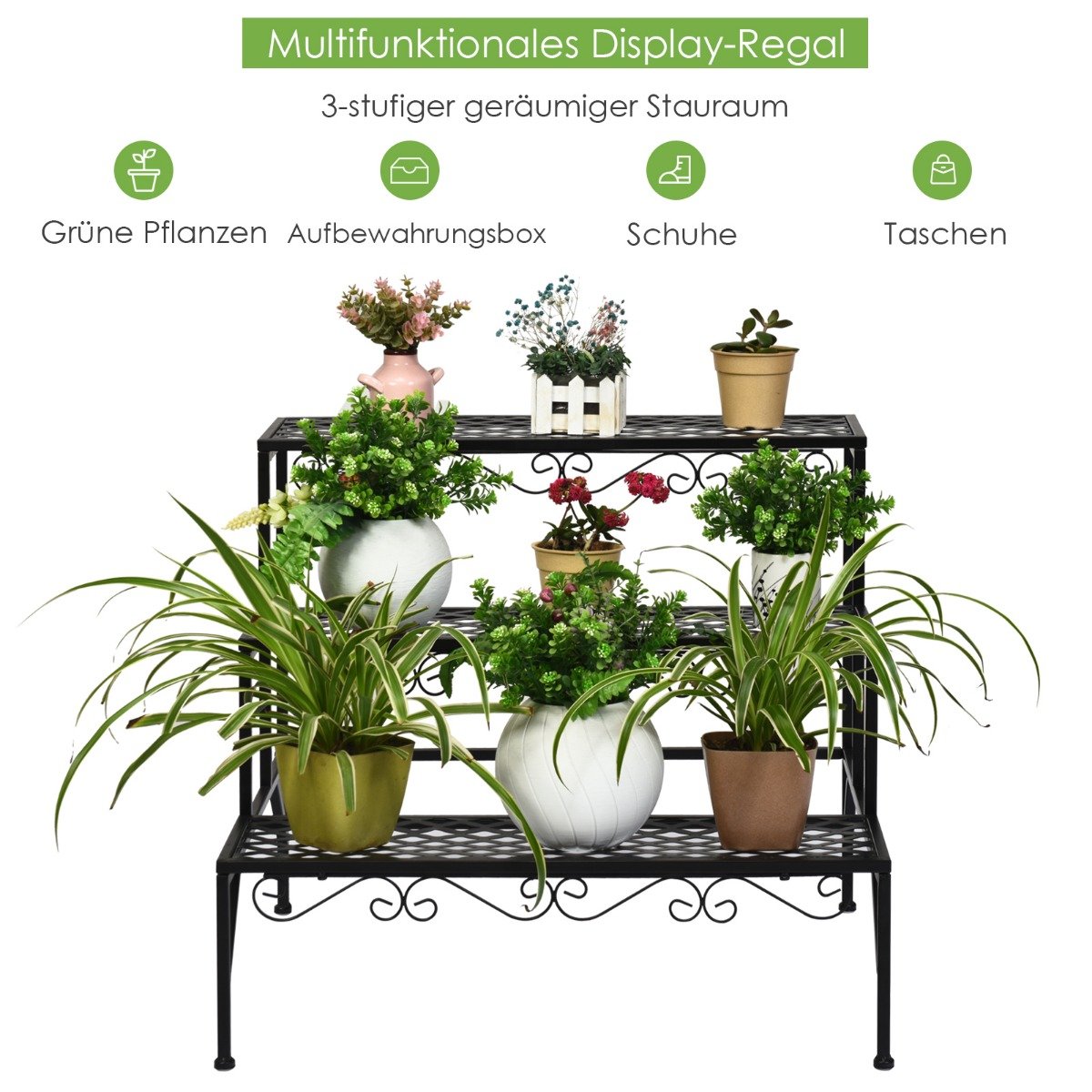Atgaivinkite savo balkoną, svetainę ar sodą su šiuo stilingu ir funkcionaliu gėlių stoveliu! Jo tvirta metalinė konstrukcija užtikrina stabilumą ir suteikia pakankamai vietos jūsų mėgstamiems augalams, gėlėms ir dekoracijoms. Milteliniu būdu dengtas paviršius yra atsparus rūdims ir oro sąlygoms, todėl šį stovą galima drąsiai naudoti tiek viduje, tiek lauke.