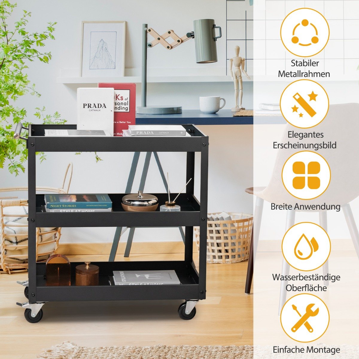 Šis universalus serviravimo vežimėlis puikiai tinka įvairioms erdvėms – nuo virtuvės ir biuro iki garažo ar dirbtuvių. Jo atviras dizainas ir didelis tarpas tarp lentynų užtikrina lengvą daiktų pasiekiamumą ir patogų laikymą.