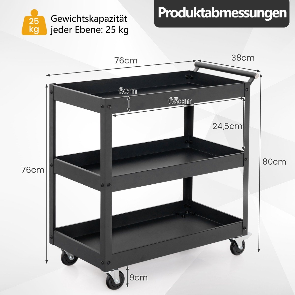 3 pakopų metalinis vežimėlis su rankenėle (Juoda)