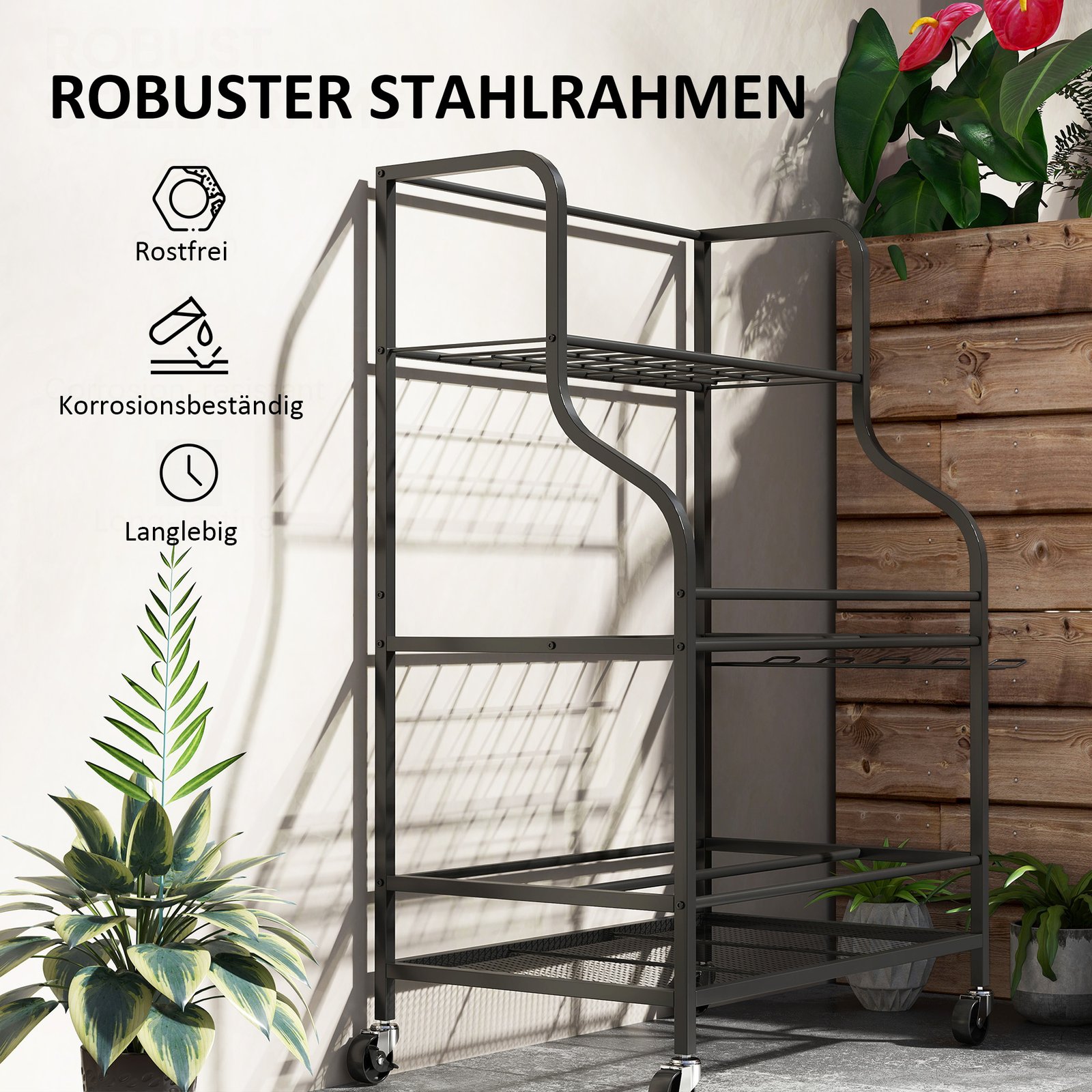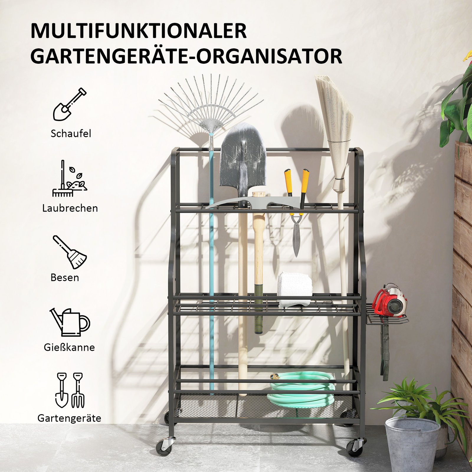 ✔ Keturi plastikiniai sodo įrankių stovo ratai užtikrina lengvą mobilumą