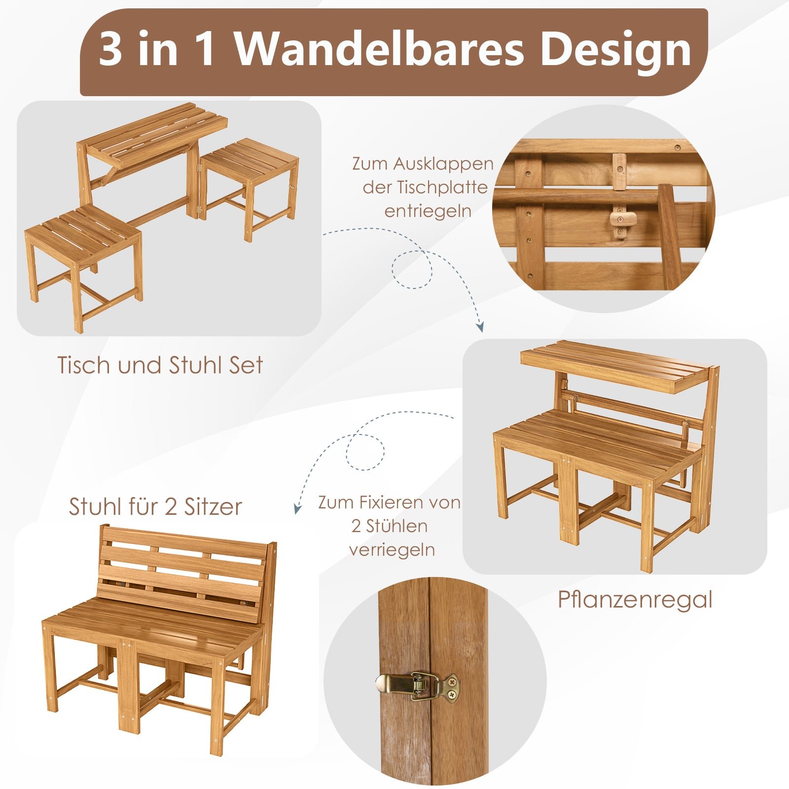 Šis universalus 3-in-1 sodo baldų komplektas, pagamintas iš masyvios akacijos medienos, sumaniai sujungia stalą, kėdes ir augalų lentyną į vieną, siūlydamas daugiafunkcį ir lengvai pritaikomą dizainą. Ergonomiškos sėdimosios vietos užtikrina ilgalaikį komfortą, o pats komplektas puikiai tinka sodo, balkono ar terasos erdvėms. Stabili konstrukcija su sustiprintomis skersinėmis atramomis ir trikampiu rėmu užtikrina didelį stabilumą ir patikimumą.
