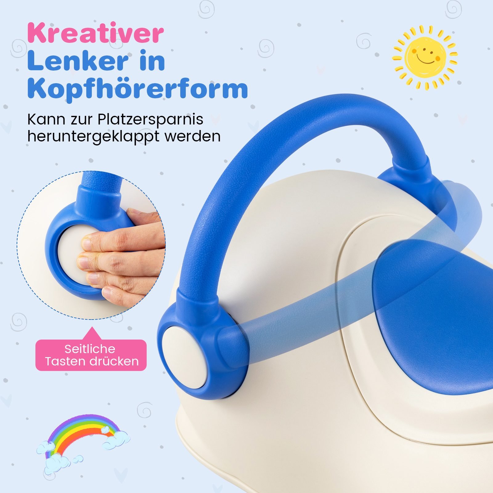 - Lengvai sulankstomas ausinių formos vairas, leidžiantis patogiai transportuoti ir laikyti žaislą.