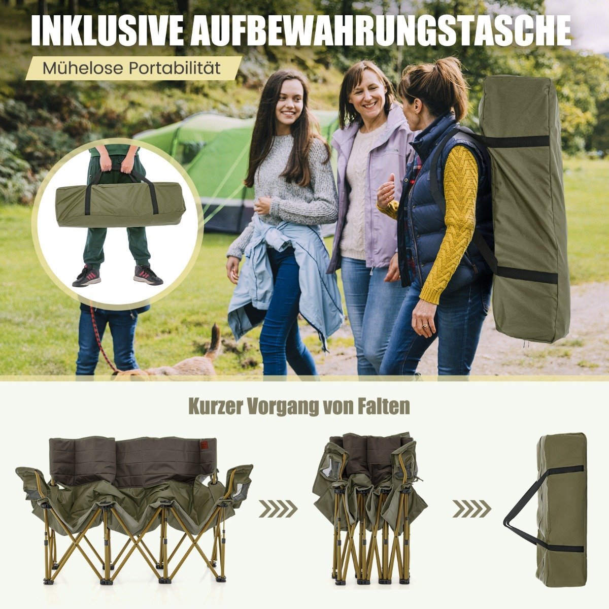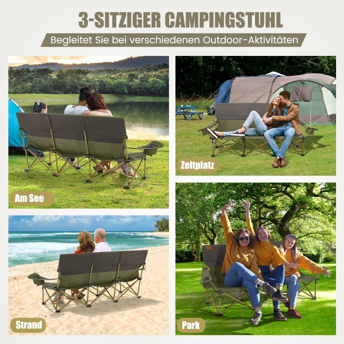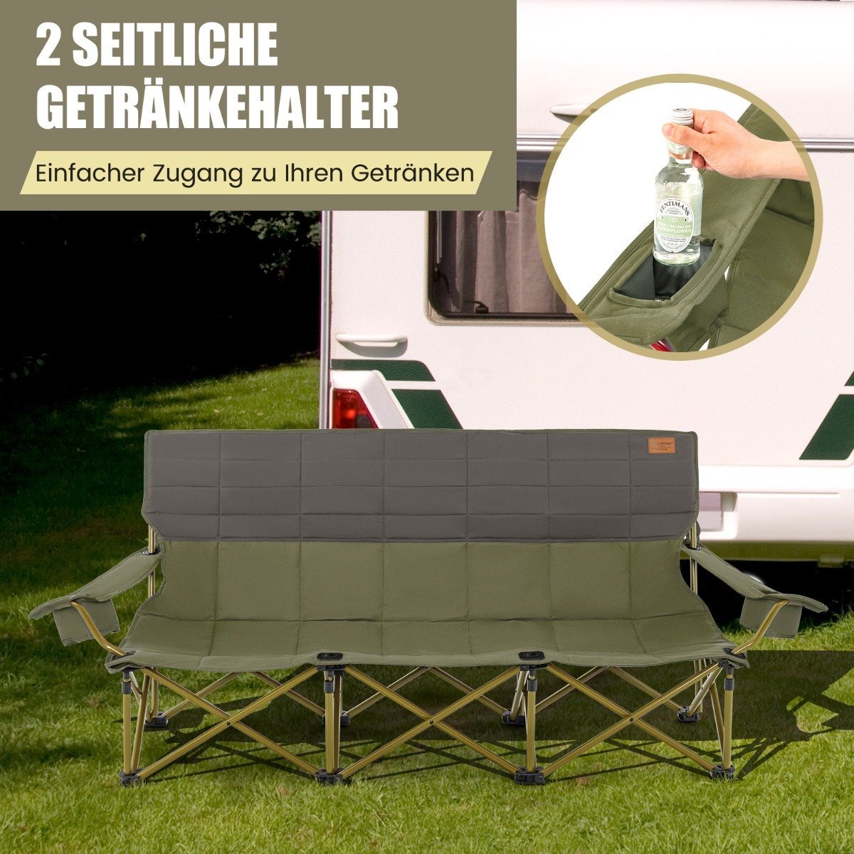 3 vietų sulankstoma lauko kempingo kėdė su puodelių laikikliais ir 450 kg talpa (Žalia)