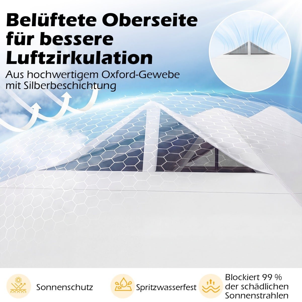- Patikima apsauga nuo saulės: Pagamintas iš aukštos kokybės Oksfordo audinio su sidabriniu padengimu, stogas efektyviai blokuoja kenksmingus saulės spindulius, o ventiliuojama konstrukcija užtikrina optimalią oro cirkuliaciją ir vėsą.