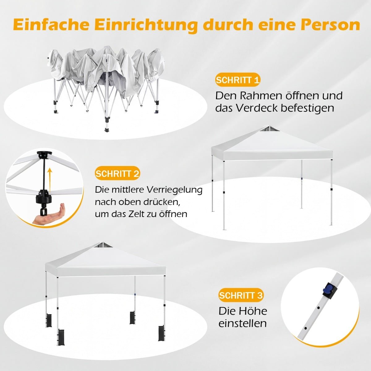 - Greitas ir paprastas surinkimas: Unikali vienos rankos centrinio užrakto sistema leidžia greitai ir be vargo pastatyti paviljoną net vienam asmeniui, nereikalaujant jokių papildomų įrankių.