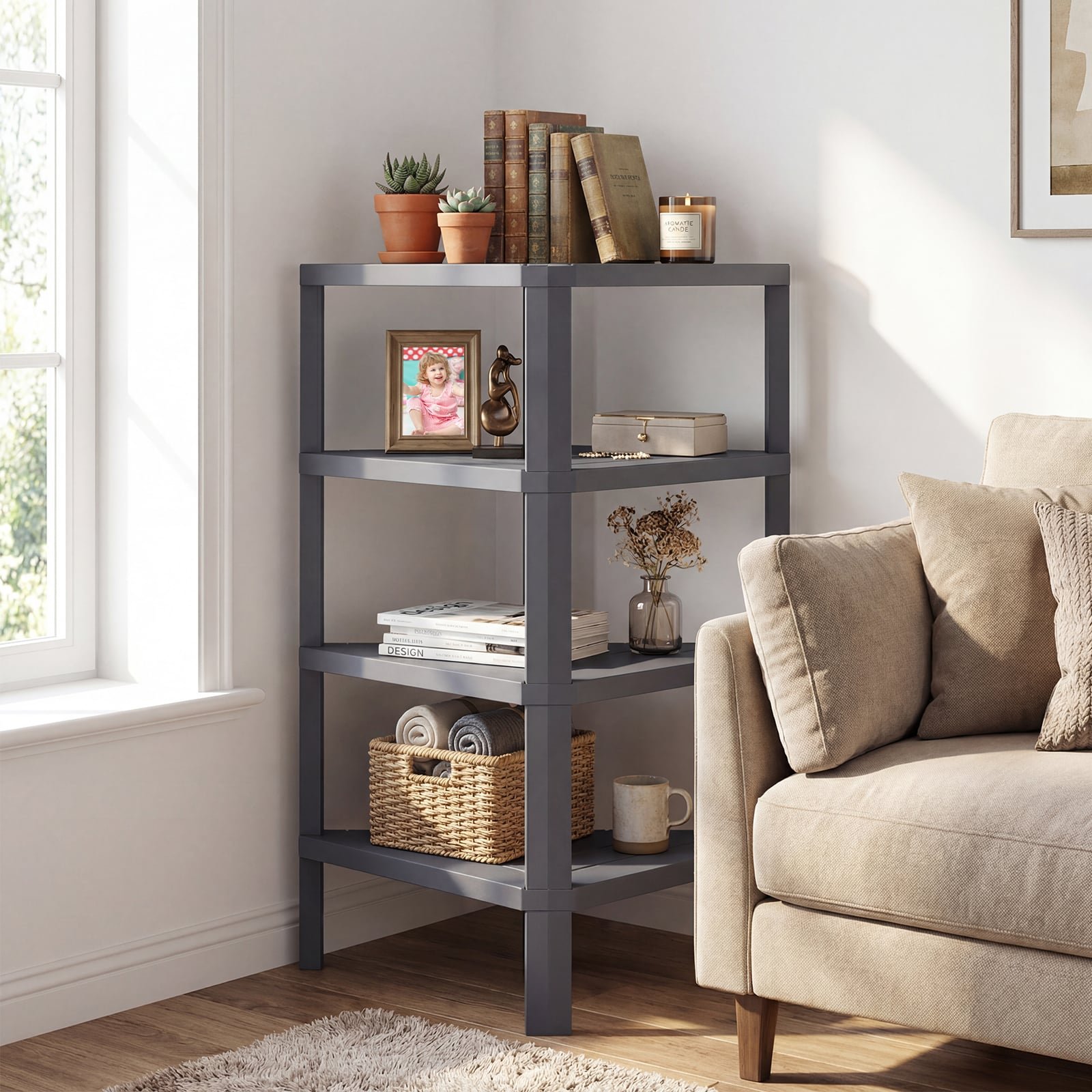 Ši 4 aukštų kampinė lentyna derina praktišką daiktų laikymą su elegantišku dizainu. Pagaminta iš patvaraus PP plastiko, ji puikiai tinka kasdieniam naudojimui, o jos 90° kampinis dizainas leidžia optimaliai išnaudoti erdvę. Atvira grotelių struktūra užtikrina, kad daiktai bus lengvai pasiekiami ir gerai vėdinami. Universalus ir funkcionalus, šis baldas puikiai papildys bet kurią patalpą.