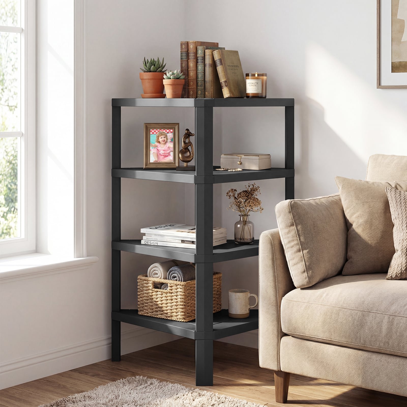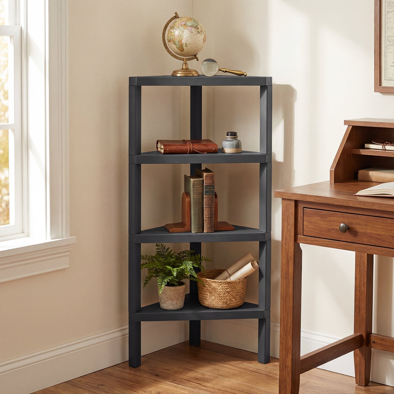 4 aukštų kampinė lentyna su atviromis grotuotomis lentynomis (Juoda)