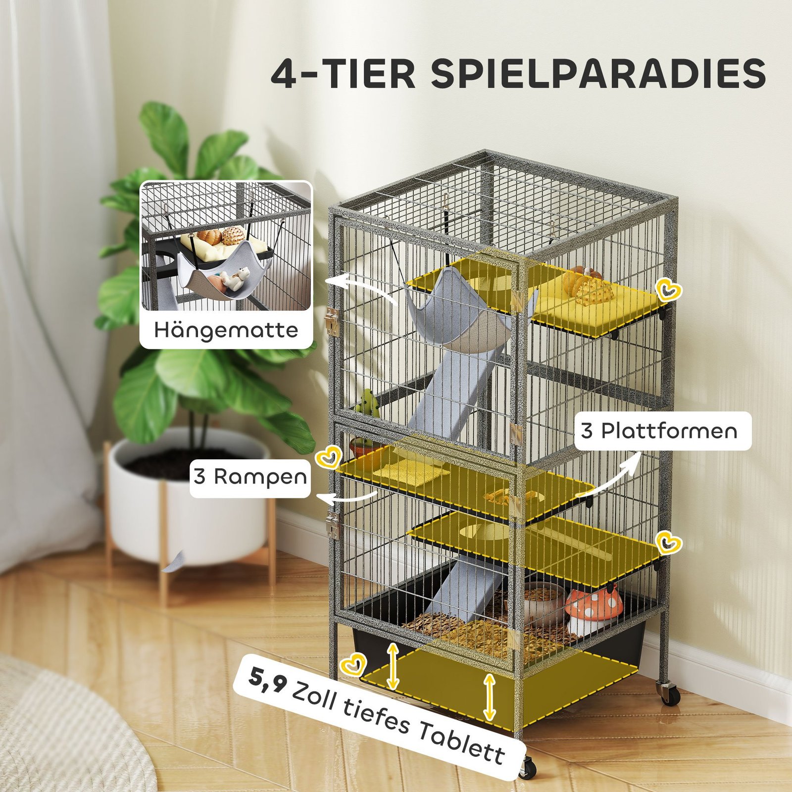 Atraskite 4 aukštų smulkių gyvūnų narvelį – erdvų ir stimuliuojantį žaidimų aikštelę šeškams, šinšiloms ir kitiems smulkiems gyvūnams! Šis apgalvotai sukurtas narvelis turi tris platformas su neslystančiomis rampomis, kurios leidžia jūsų augintiniams laipioti, šokinėti ir tyrinėti. Stabilus metalinis rėmas užtikrina ilgaamžiškumą ir stabilumą, o dvi didelės priekinės durelės palengvina gyvūnų maitinimą, valymą ir bendravimą su jais.