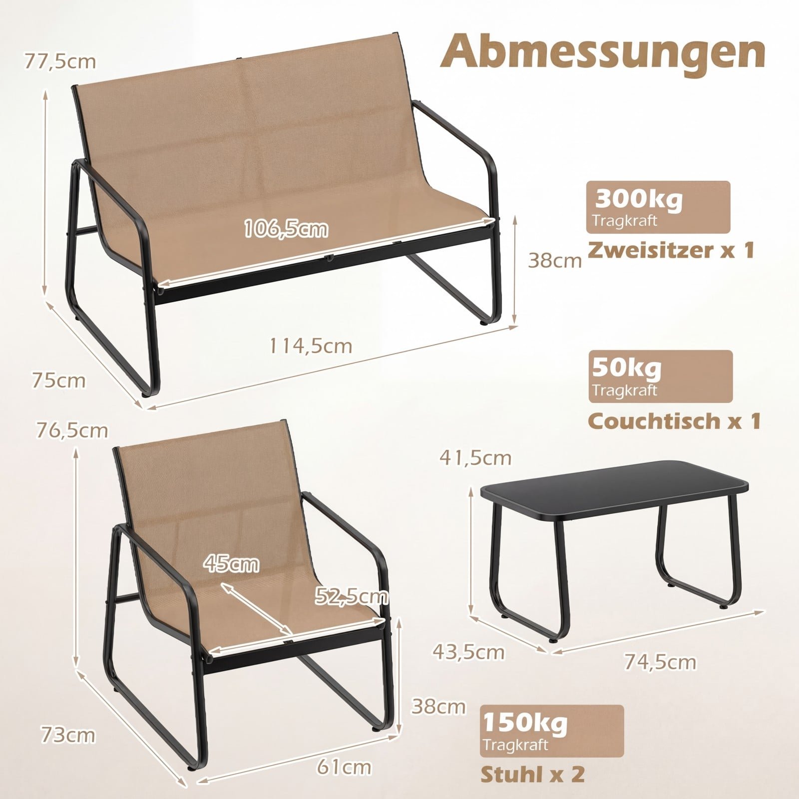 • Kiekvienos kėdės maksimali apkrova: 150 kg