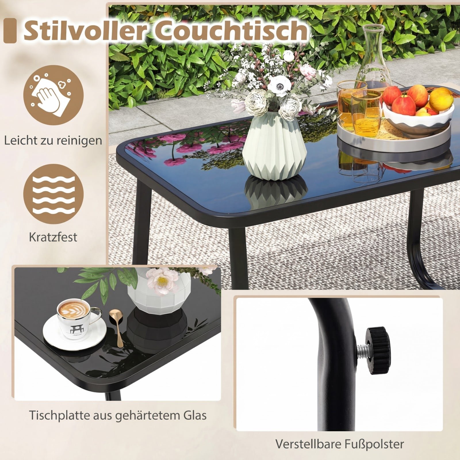 • Funkcionalus kavos staliukas su grūdinto stiklo stalviršiu ir neslystančiais padukais užtikrina stabilų daiktų padėjimą.