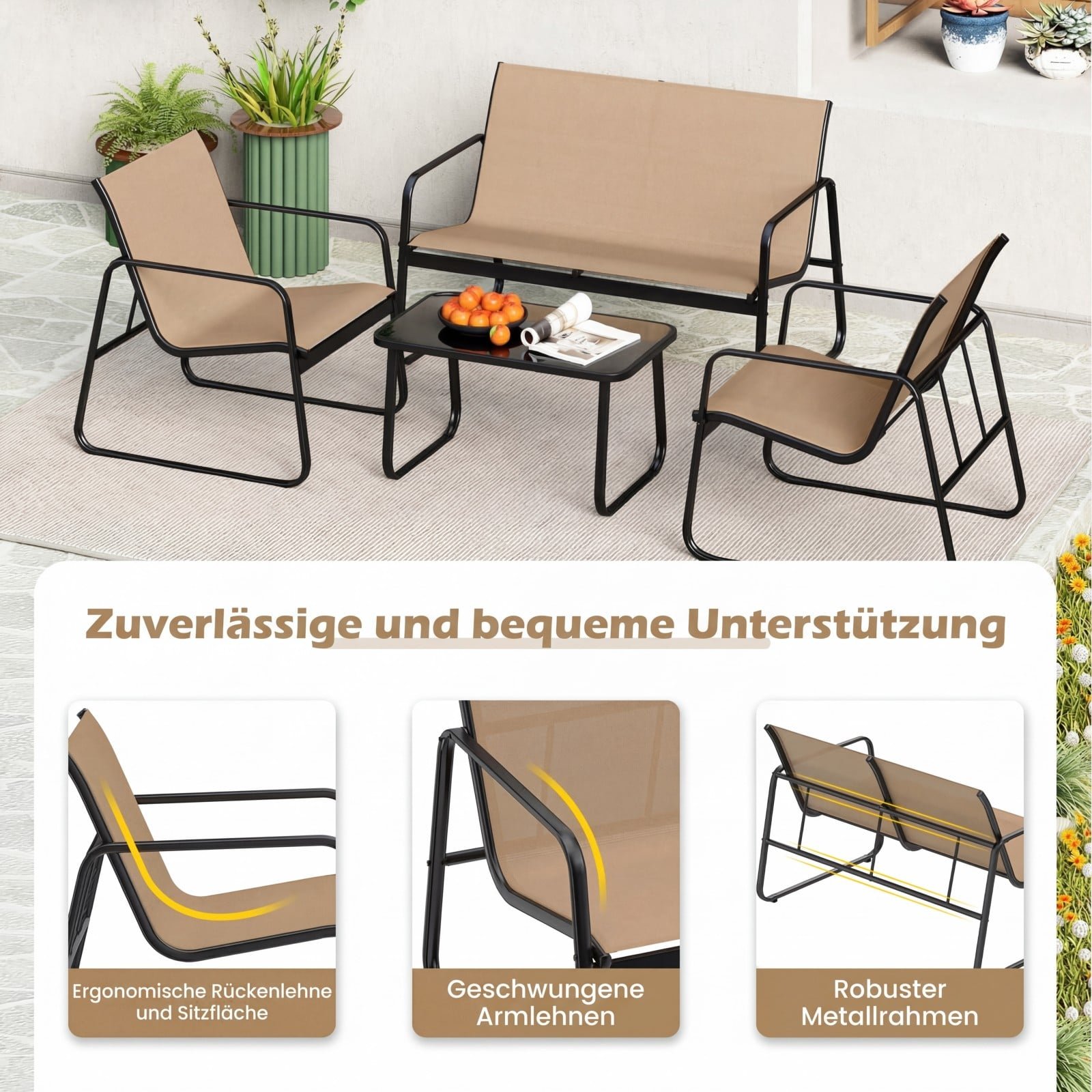 Mėgaukitės nuostabiomis popietėmis su mūsų 4 dalių terasos baldų komplektu! Šis lauko baldų komplektas puikiai tinka įvairioms lauko erdvėms, tokioms kaip kiemas, veranda, balkonas ar baseino zona. Aukštos kokybės kvėpuojantis audinys užtikrina patogią ir tvirtą atramą jūsų kūnui, o stabilus metalinis rėmas garantuoja patikimą stabilumą.