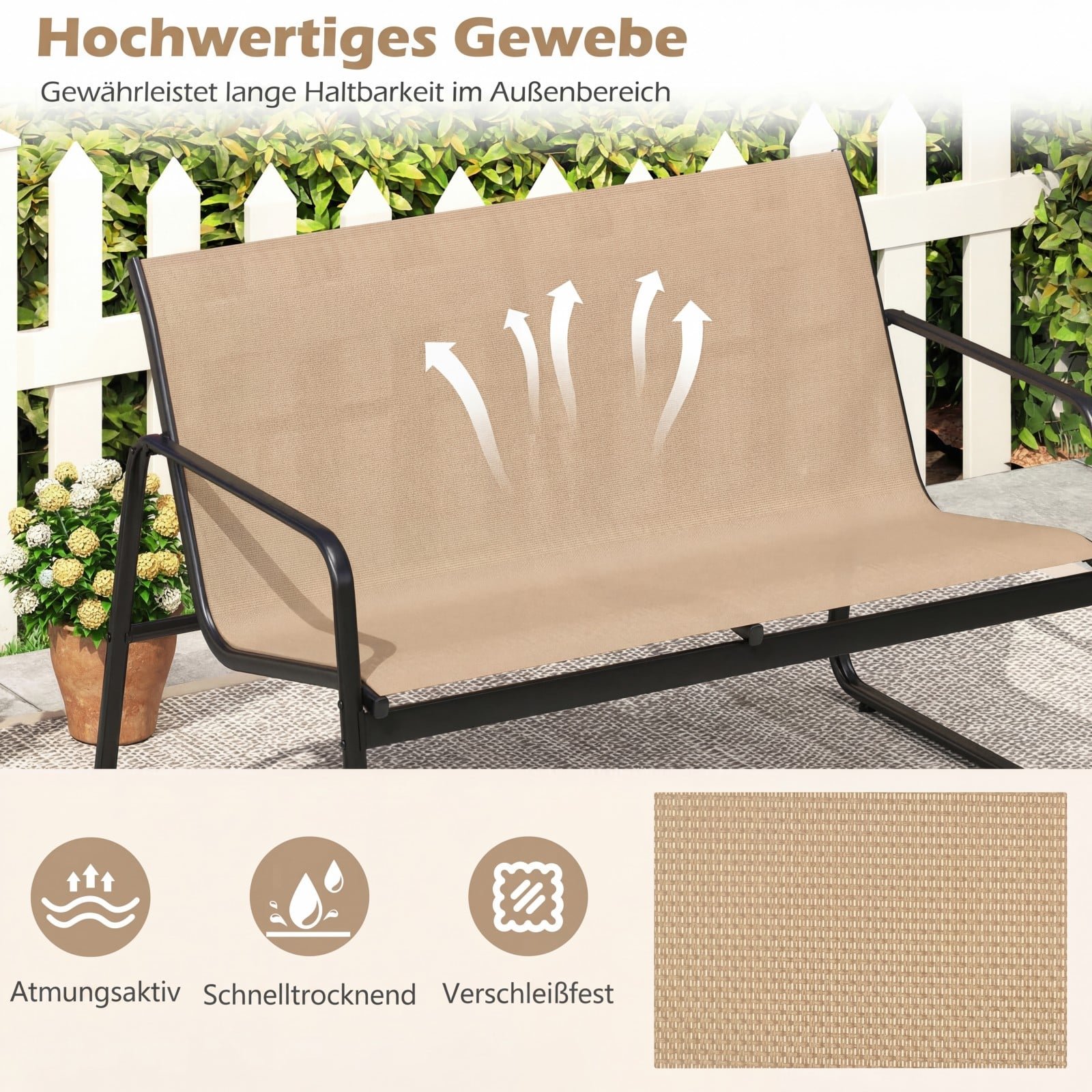 • Tvirtas metalinis rėmas atlaiko didelę apkrovą ir yra atsparus rūdims, garantuodamas ilgaamžiškumą lauko sąlygomis.