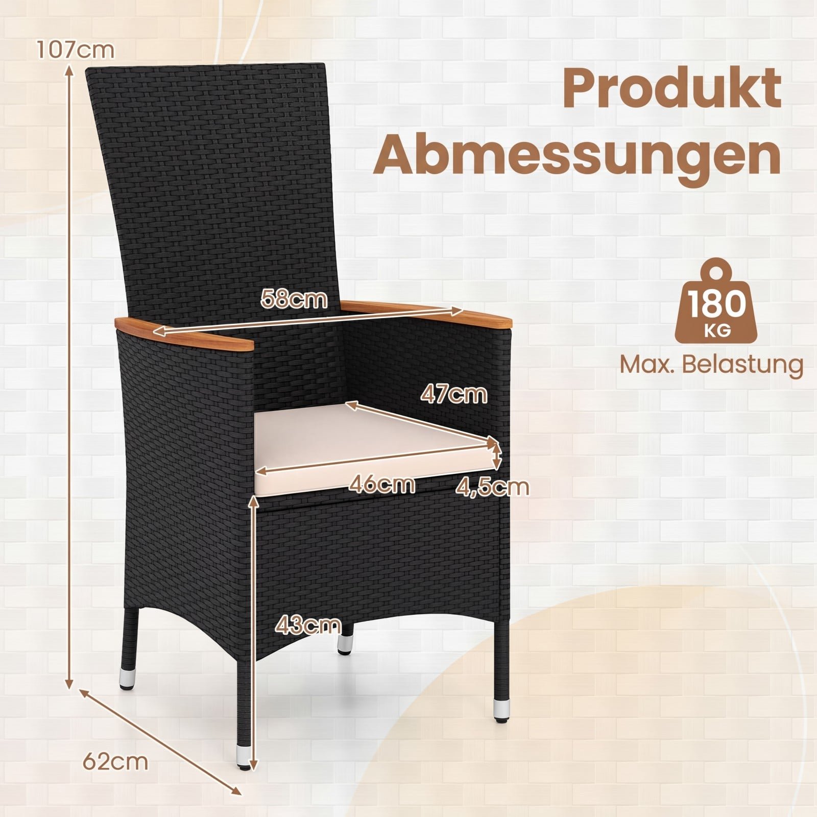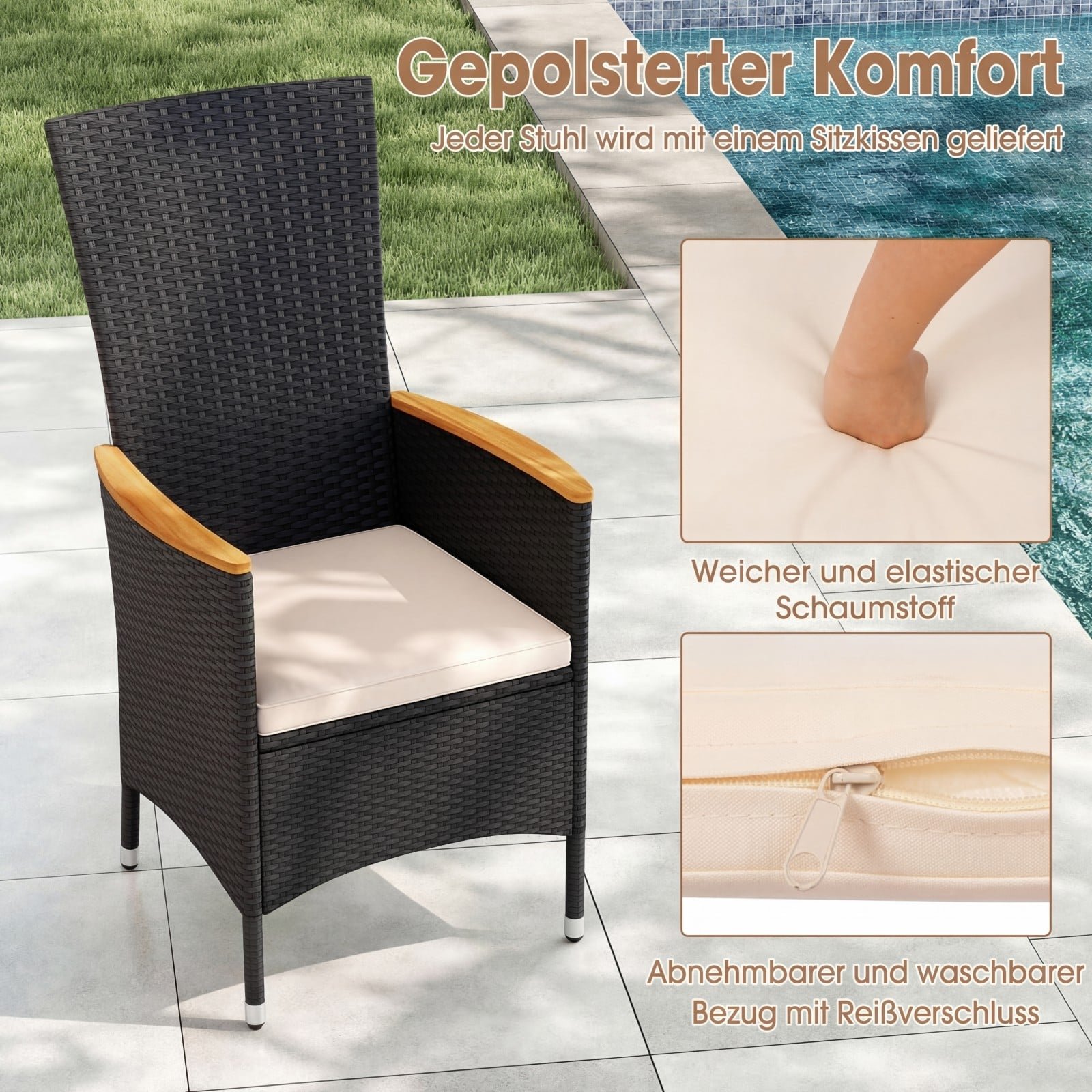 Mėgaukitės stilingomis ir atpalaiduojančiomis akimirkomis lauke su šiomis elegantiškomis sodo kėdėmis. Rankomis pintas PE rotangas yra atsparus UV spinduliams ir blukimui, o jo struktūra užtikrina gerą oro cirkuliaciją, todėl puikiai tinka naudoti balkone, terasoje, sode ar prie baseino. Kiekviena kėdė komplektuojama su minkšta ir patogia sėdynės pagalvėle, užtikrinančia maksimalų komfortą, o aukštas atlošas ir lenkti akacijos medienos porankiai suteikia papildomos atramos ir ergonomiškumo.