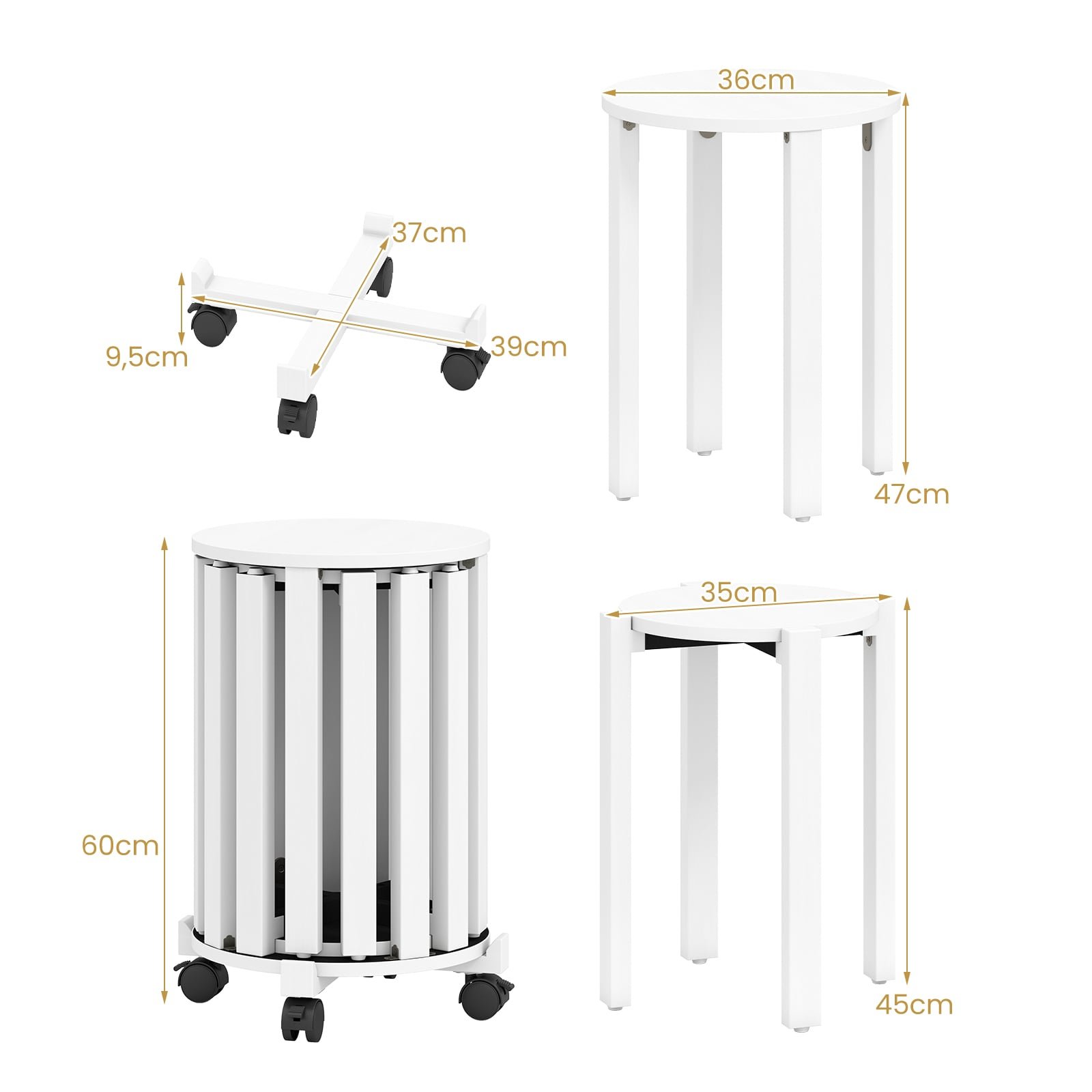 • Kiekvienos mažos kėdutės matmenys: Ø 35 cm, Aukštis 45 cm