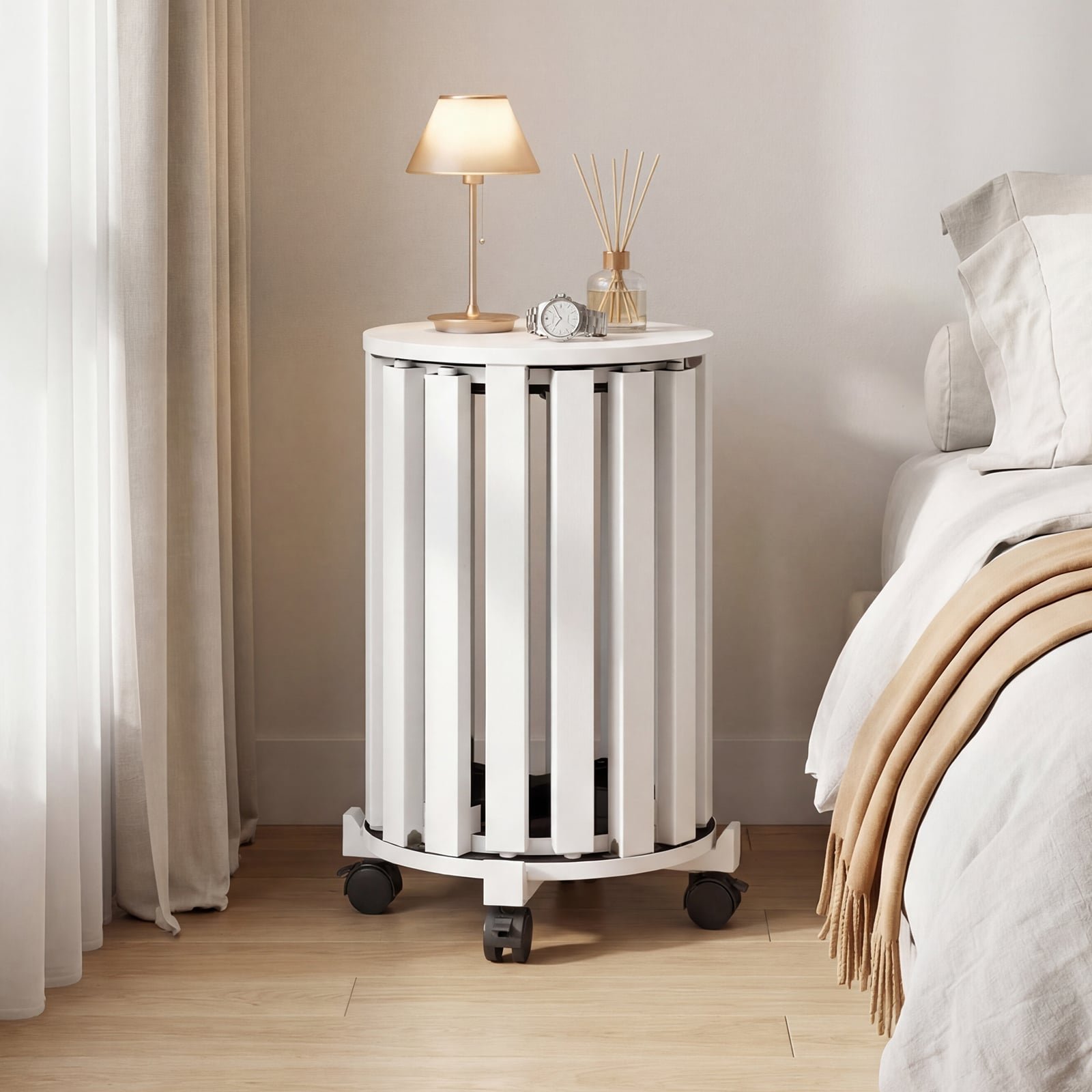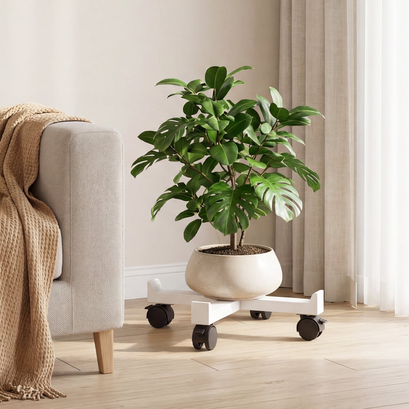 • Lankstus mobilumas su ratukais: Integruota bazė su 360° besisukančiais ratukais leidžia lengvai perstumti baldus, o fiksavimo mechanizmas užtikrina stabilumą. Bazė taip pat gali tarnauti kaip mobilus augalų stovas.