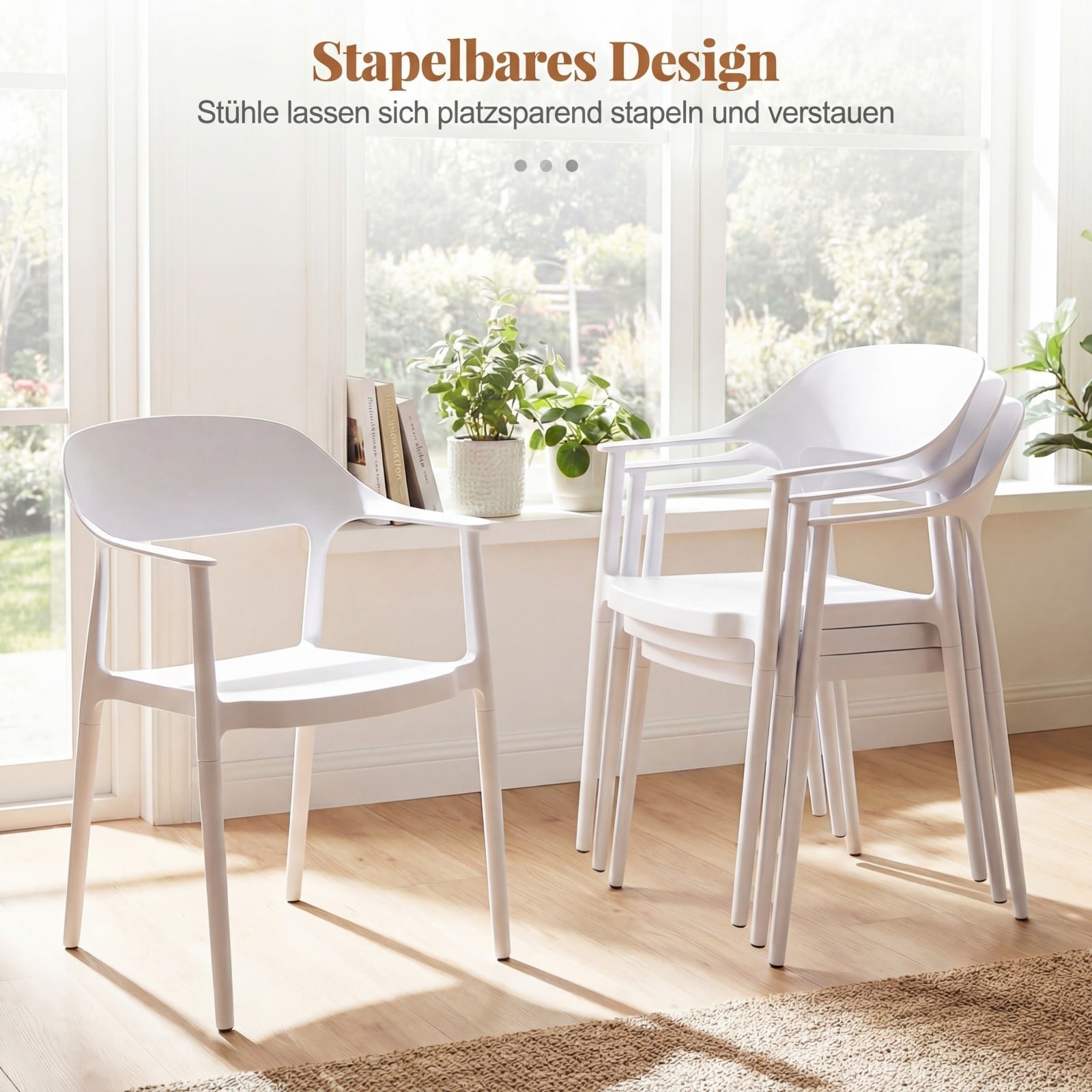 Šis 4 dalių valgomojo kėdžių rinkinys, pagamintas iš patvarios, oro sąlygoms atsparios PP medžiagos, puikiai tinka tiek vidaus, tiek lauko erdvėms. Dėl atsparumo spalvos blukimui, lengvos priežiūros ir patogaus transportavimo, šios kėdės yra praktiškas ir stilingas pasirinkimas. Ergonomiškai išlenktas atlošas, patogūs porankiai ir erdvi sėdynė užtikrina maksimalų sėdėjimo komfortą, o galimybė jas sukrauti vieną ant kitos taupo vietą.