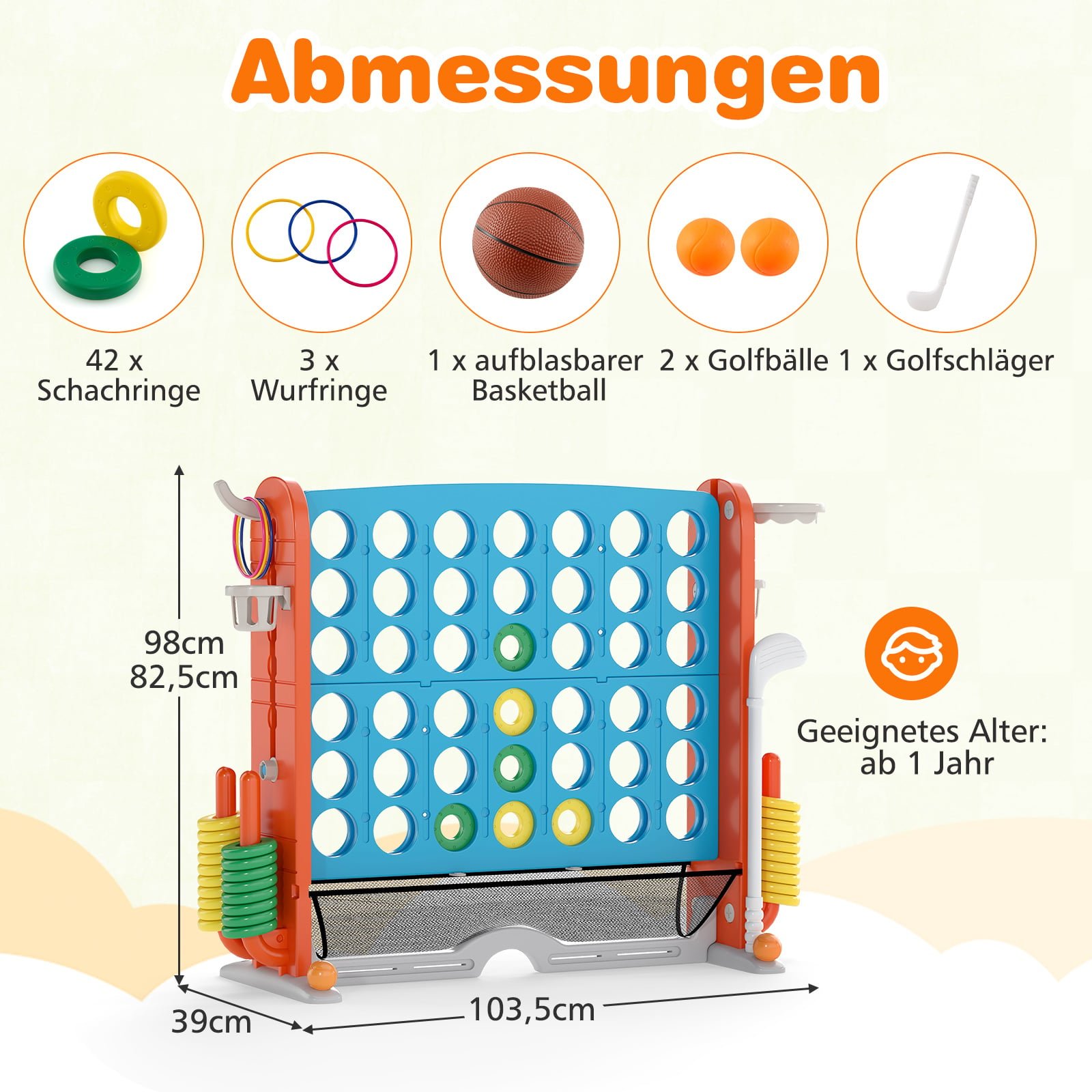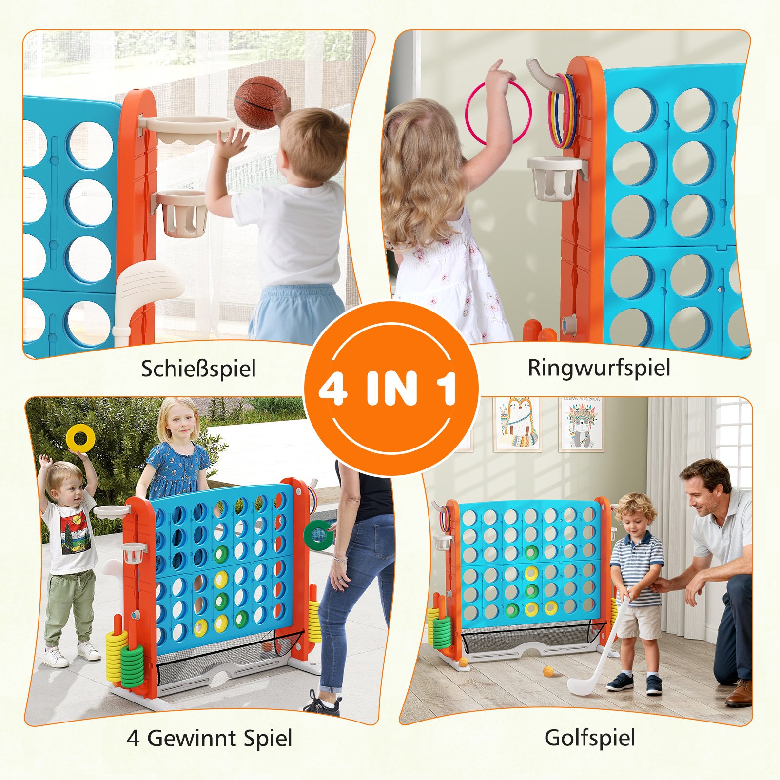 - 4-in-1 žaidimų įvairovė: „Keturios eilėje“, krepšinis, žiedų mėtymas ir mini golfas.