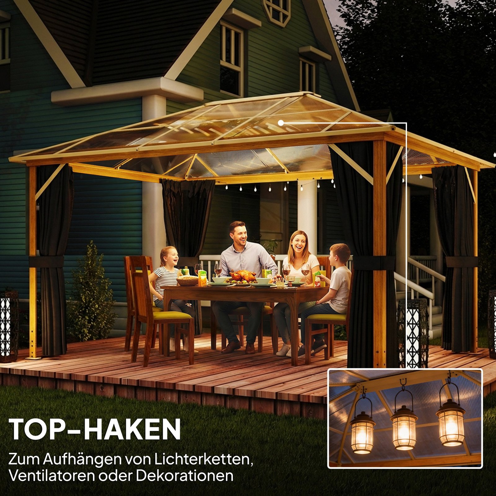 Sukurkite patogų, privatų lauko prieglobstį su maždaug 4 x 3 m sodo pavėsine. Tvirtas polikarbonato stogas praleidžia dienos šviesą ir apsaugo nuo bet kokio oro. Uždarytos užuolaidos sukuria ramią vietą – puikiai tinkančią atsipalaiduoti ar SPA procedūroms – o atviros užtikrina vėdinamą atmosferą. Stabilus aliuminio rėmas, tvirtinimo elementai ir lubų kabliai sukuria individualią sodo oazę.